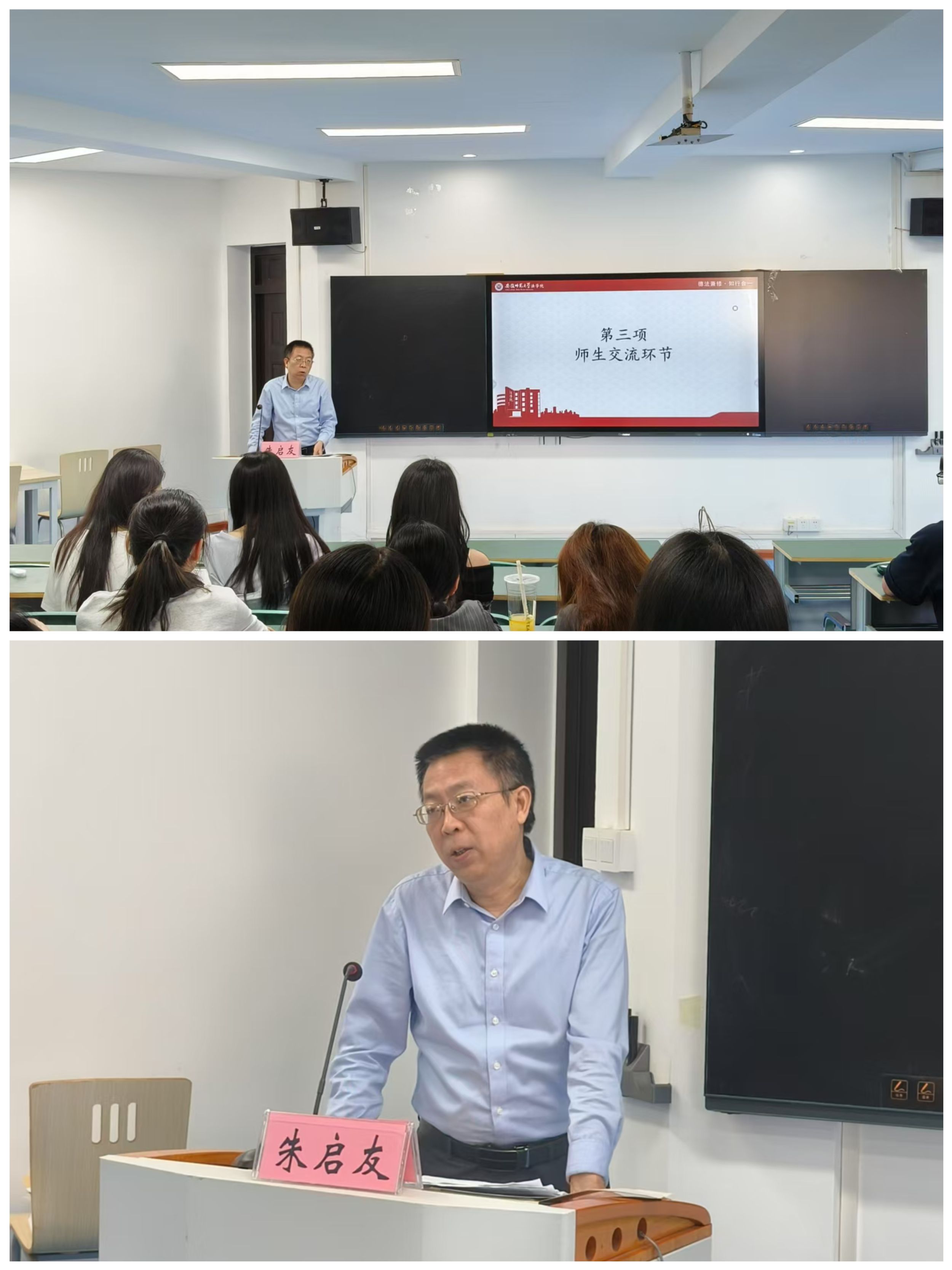 在师生互动环节,班主任朱启友针对问题进行解答。他指出,实习和考研并不矛盾,关键是端正心态、合理利用时间。跨专业考研需先明确动机,再权衡利弊。此外,朱老师还对暑假备考地点选择、考研整体规划等问题给出具体建议。