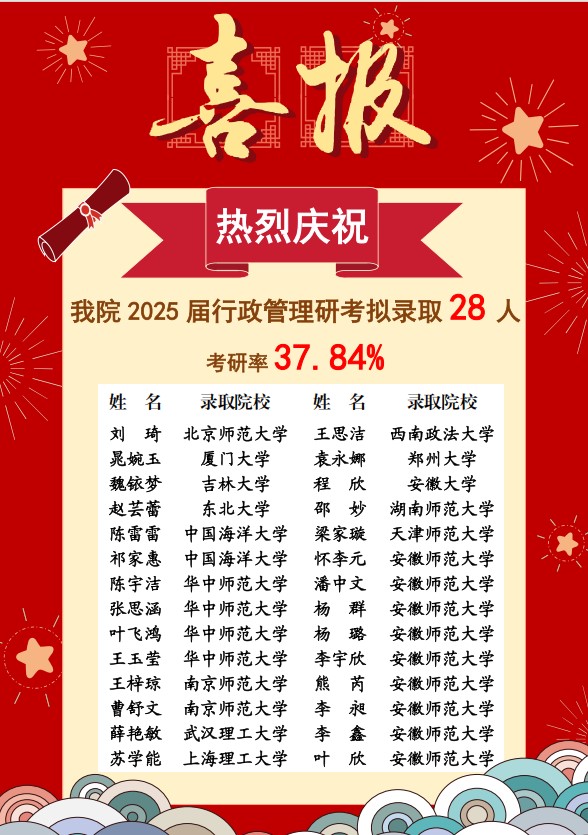 春风送捷报,研途传佳音。近日,2025年全国硕士研究生招生考试落下帷幕,英国上市公司3652021行政管理专业毕业生陆续传来喜讯,专业总体升学率达37.84%创近年新高多位员工被北京师范大学、厦门大学、吉林大学、东北大学、中国海洋大学等知名高校录取,以亮眼成绩书写人才培养新篇章。