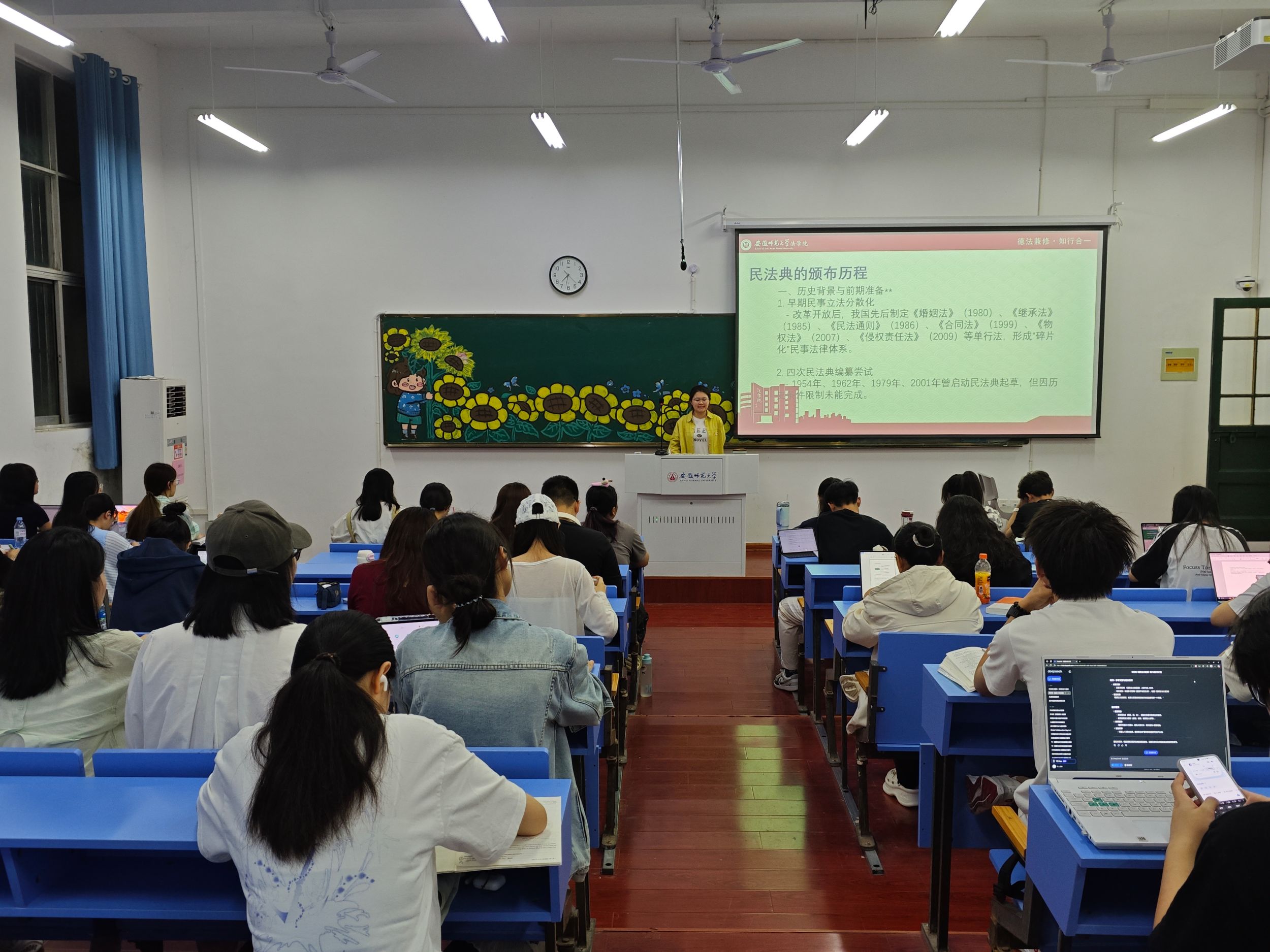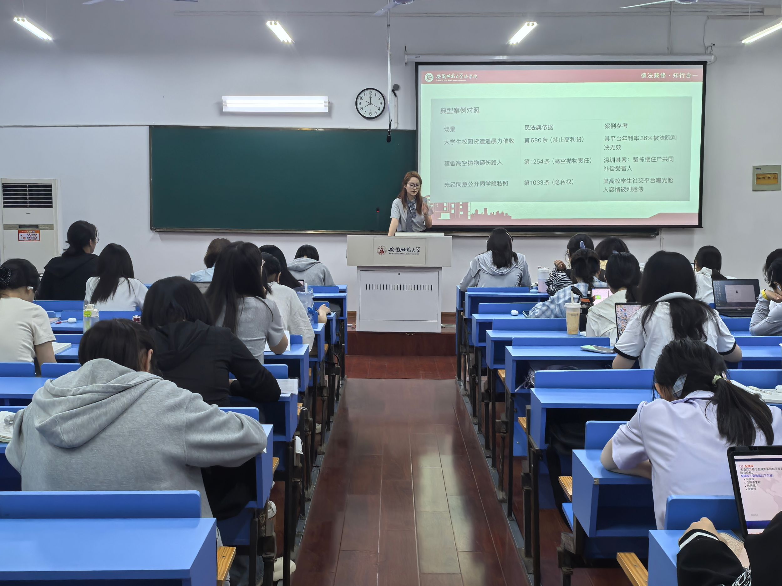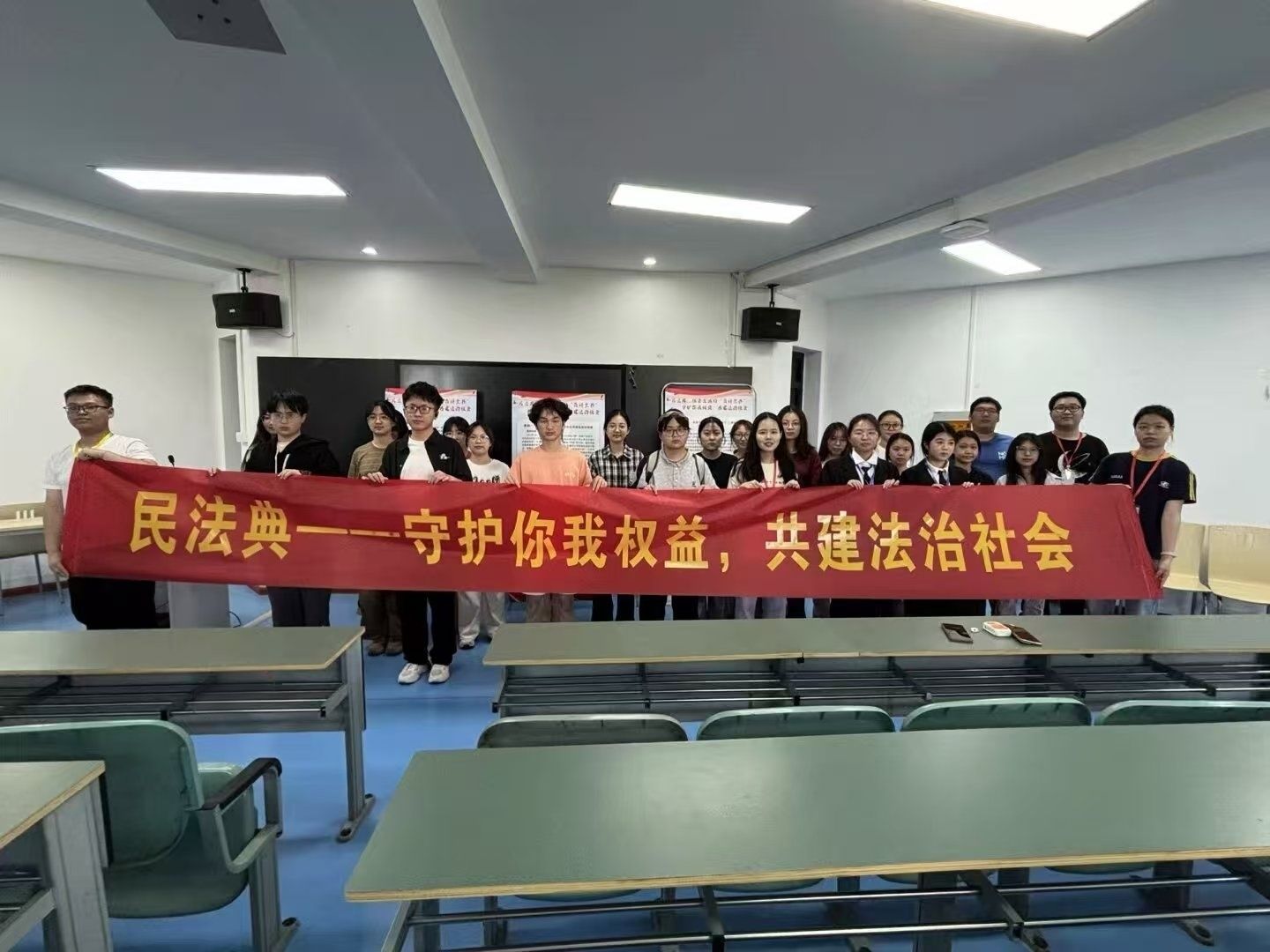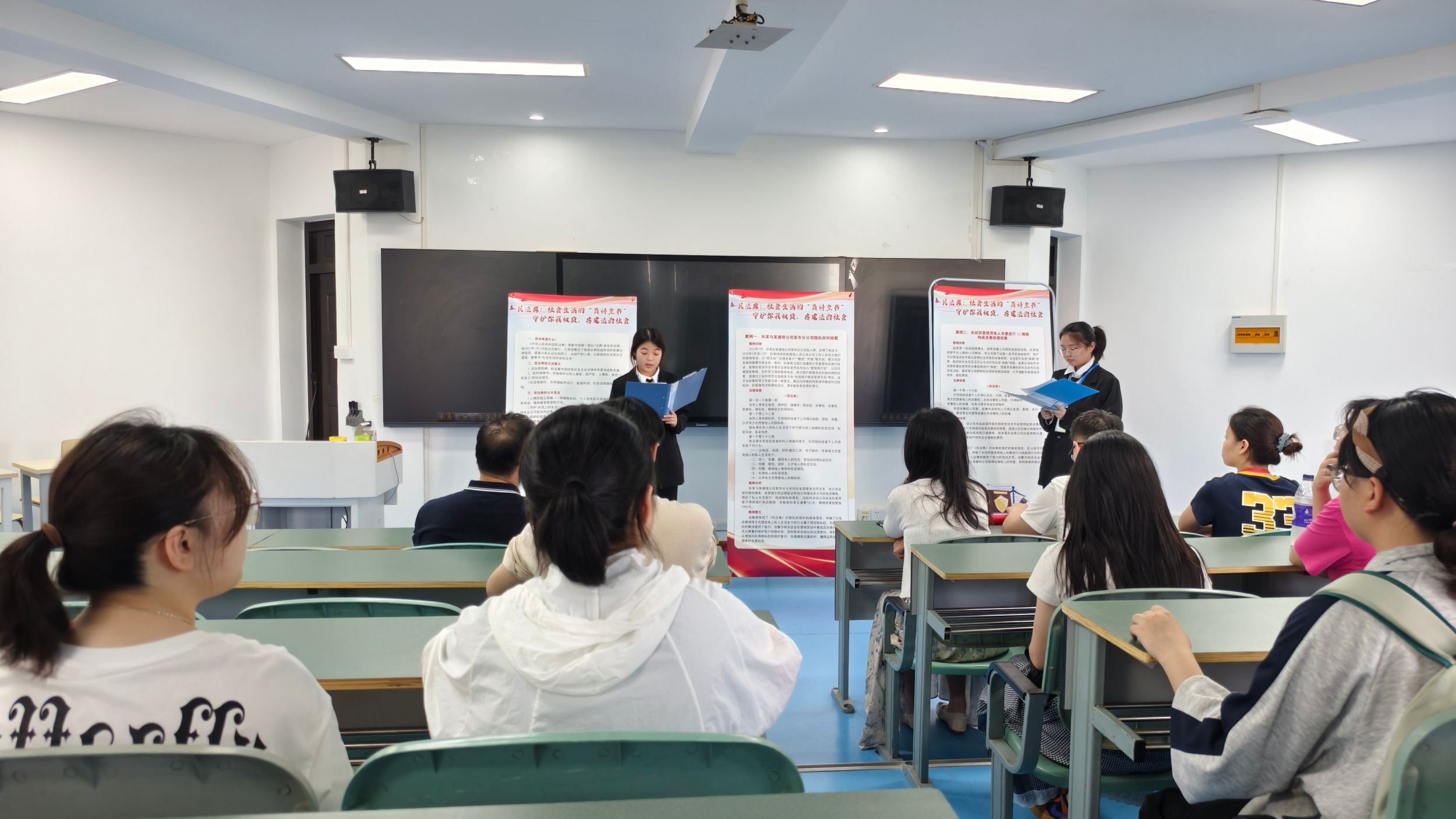 公司社团青年法学社开展“送法进班级”、“情景剧展演”等系列主题活动,通过多维度的普法实践,将千余条法律文本转化为生动的"社会生活指南",助力青年学子实现从"被动知法"到"主动用法"的思维跃升。宣讲活动围绕“民法典的本质内涵”这一核心,采用“内涵定义—立法初衷—核心特色—生活融合—学习意义”的五维结构进行深入剖析。在活动现场,宣讲员以“民法典是什么”为切入点,生动贴切地阐述了民法典的现实意义。在晚自习教室内,宣讲员以时下与民法典密切联系的热点话题为引,与同学们进行了热烈的交流与互动。