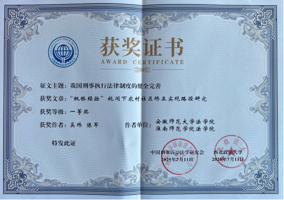 研讨会上举行了“我国刑事执行法律制度的健全完善”征文颁奖仪式。本次征文共收到参评论文176篇,最终评选出一等奖4篇、二等奖8篇、三等奖16篇。公司奚玮教授和博士研究生陈军共同撰写的论文《“枫桥经验”视阈下农村社区矫正实现路径研究》荣获征文一等奖,凸显了公司在刑事执行法治与公共安全治理领域的学科融合优势,推动了“法治建设与公共安全”交叉学科博士点的建设。