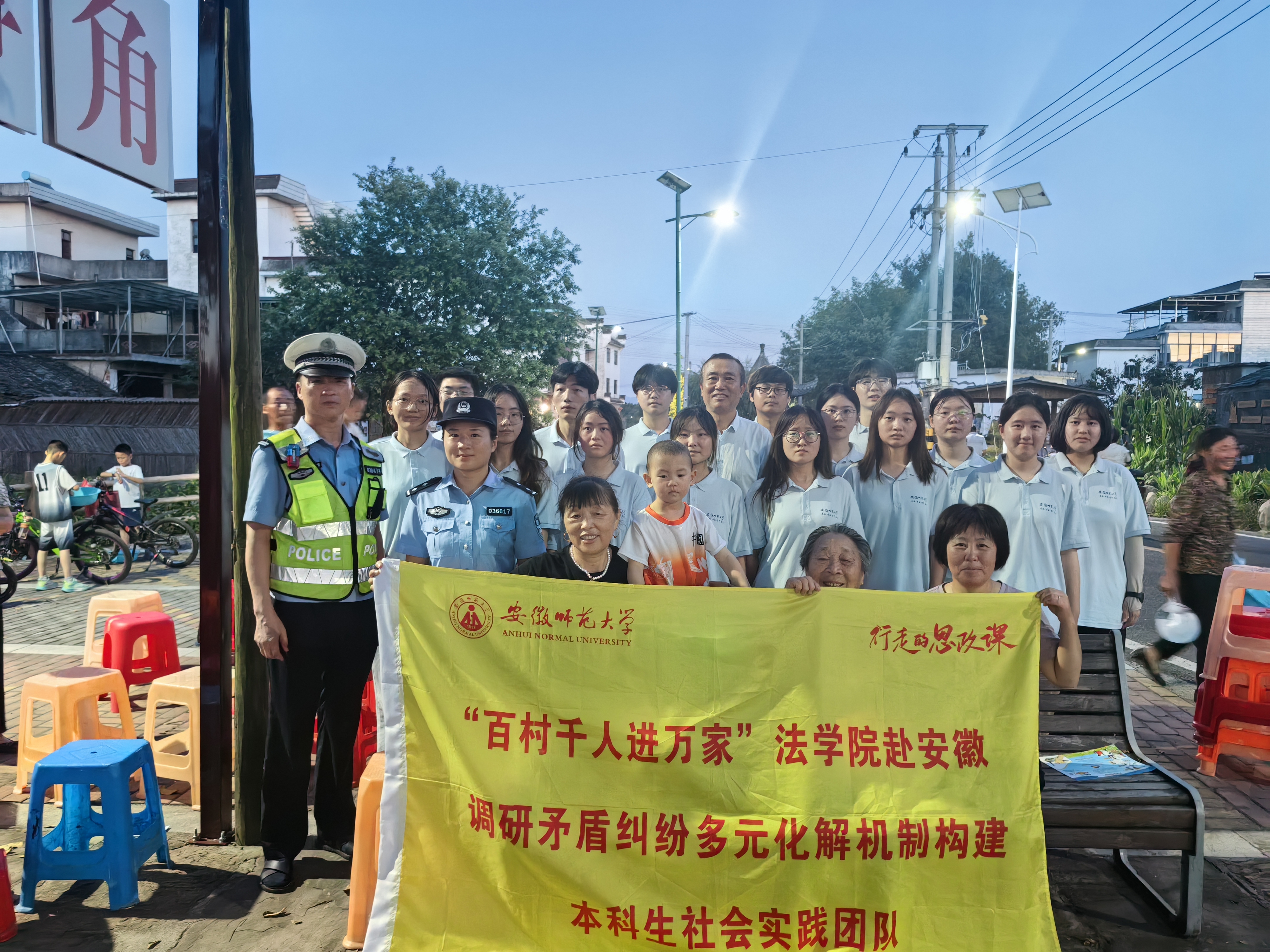 7月3日晚,周仁标老师带领同学们到歙县西溪南村针对全村的村民,就调解邻里矛盾纠纷开展现场法治宣讲,同学们用小品的形式展现了日常生活中邻里间可能出现的矛盾纠纷(如房屋装修),从纠纷的出现到邻里间的争吵,再到社区工作人员现场宣传法制常识和进行耐心地劝导和调解,最终使矛盾双方的纠纷得到化解,邻里关系重归友好,让现场的村民们深切地了解到德治和法治相结合的重要性。