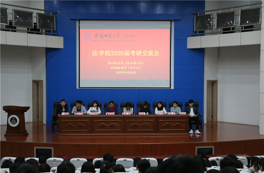 4月26日下午,2016级法学(含卓越司法)、2018级法学(专升本)专业在敬文报告厅举办2020届考研交流会,此次交流会邀请到王俊文、宋杰、鲁夏、陈娜娜、尹洁、朱慧、左然然、范梦晴、姚言峰9位同学为大家作分享交流。交流会由16法学辅导员储梦凡主持,16行管辅导员桂彬、18法学(专升本)辅导员黄世凯受邀出席,16法学(含卓司)、18法学(专升本)全体成员共同参加。