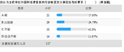 为了了解近年来外国刑法教学对法考(以及原司法考试)的影响,课程教师设计了一份《法律职业考试与外国刑法课堂教学》的调查问卷(见附件),通过微信问卷星程序对2017级法学本科生(目前大四)以及2015级和2016级法学本科毕业生(目前研究生在读或已就业)进行调查,收回有效问卷117份,发现目前外国刑法教学存在如下情况。
