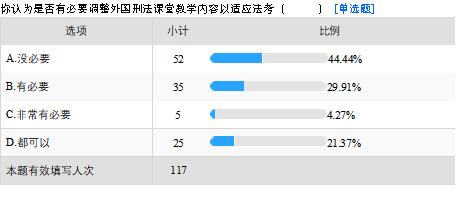 关于是否有必要调整外国刑法课堂教学内容以适应法考的调查中,选择“有必要”和“非常有必要”的共占34.18%,选择“没必要”和“都可以的”占65.81,说明目前员工能够理解教师的授课方式,并适应目前的教学内容,没有调整教学内容的强烈期待。因此,可以在现有基础上,结合法考内容稍作调整。