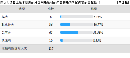 问卷中选择教材与法考匹配性“大”和“比较大”的共为35.9%,选择匹配性“不大”和“没有”的共为64.1%,说明该教材在一定程度上与法考具有一致性,主要以三阶层递进式判断的犯罪理论体系以及事实判断与价值判断相结合的二元思维方式,与当前法考对考生法治思维与法治能力的考察方向基本一致。但由于国情和法治实践的不同,因而教材的具体内容与中国的法律体系还存在差异;另外,由于培养目标不同,造成外国刑法教材内容与法考内容存在较大差异。外国刑法教材重在说明外国刑事立法的法律理由与社会背景,学说基础与争论焦点,以开阔学术视野,了解多元法律文化背景,夯实员工法律底蕴和法律思维能力为基本目标,而法考主要以检验考生在法律适用和事实认定等方面的法治实践水平,以达到法律职业入职资格为基本目标,故存在较大差异。