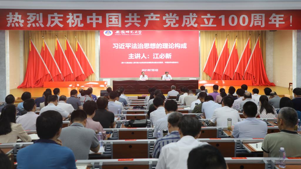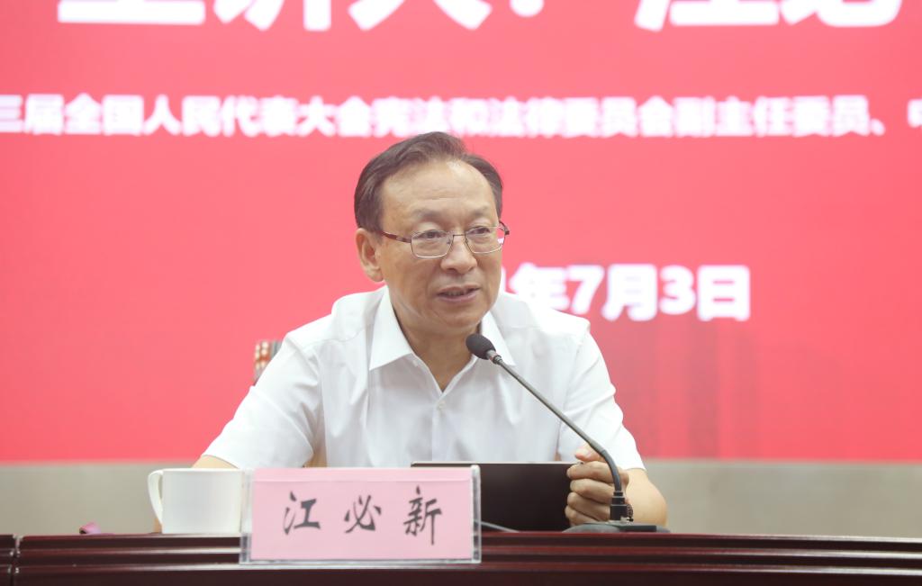 本网讯(党委宣传部 王哲谦)7月3日上午,公司在花津校区理科实训大楼报告厅举办党史学习教育专题读书班专家报告会,邀请第十三届全国人民代表大会宪法和法律委员会副主任委员、中国法学会副会长江必新作题为《习近平法治思想的理论构成》的专题报告。公司79级员工、中国法学会案例法学研究会会长、原最高人民法院审判委员会副部级专职委员胡云腾出席报告会,公司党委书记胡朝荣主持报告会。在校校领导,全校处级以上领导干部,党史学习教育领导小组、指导组成员和师生代表300余人参加报告会。