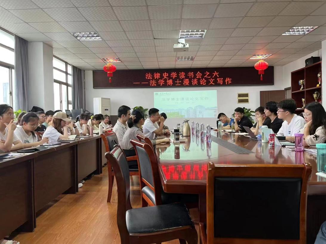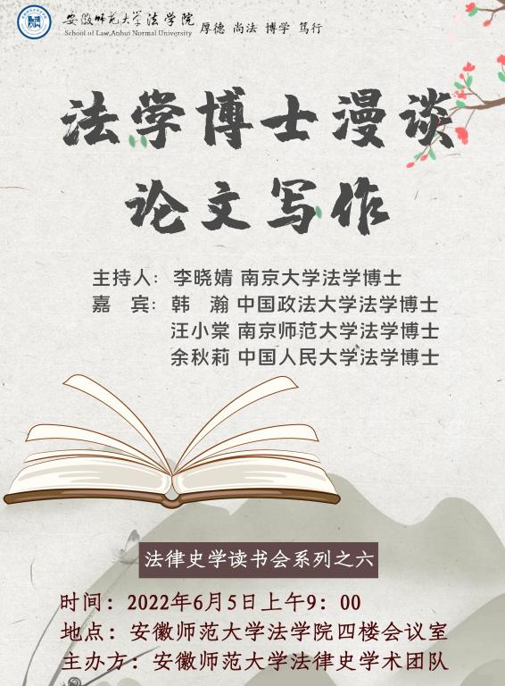 2022年6月5日上午,“安师大法律史学系列读书会第六期”在英国上市公司365四楼会议室成功举行。本次读书会的主题是“法学博士漫谈论文写作”。读书会以同学们在学术论文写作过程中经常遇到的问题为出发点,通过师生之间的经验分享与交流,来为同学们的日常写作提供一些实质性的帮助,进一步提高同学们的写作水平与学习能力。此次读书会由李晓婧副教授主持,嘉宾为韩瀚老师、汪小棠老师和余秋莉老师。英国上市公司365法律史学专业的全体研究生、其他专业的部分研究生以及有志于法史研究的本科生参与了本次交流会。