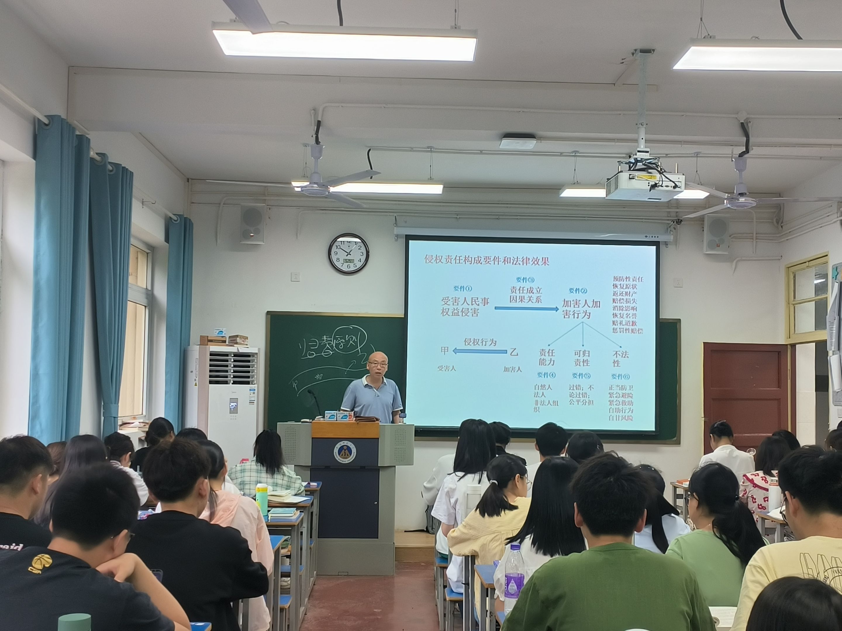 在法学二班的课堂上,李胜利从民事责任的分类入手,结合相关案例,详细讲解了以民事责任归责方法划分的过错责任、无过错责任与公平责任的概念和特征,强调了民法的七大价值取向。课堂内容丰富,教师精神饱满,同学们认真做笔记并积极翻阅民法典,结合法条理解课程知识点。