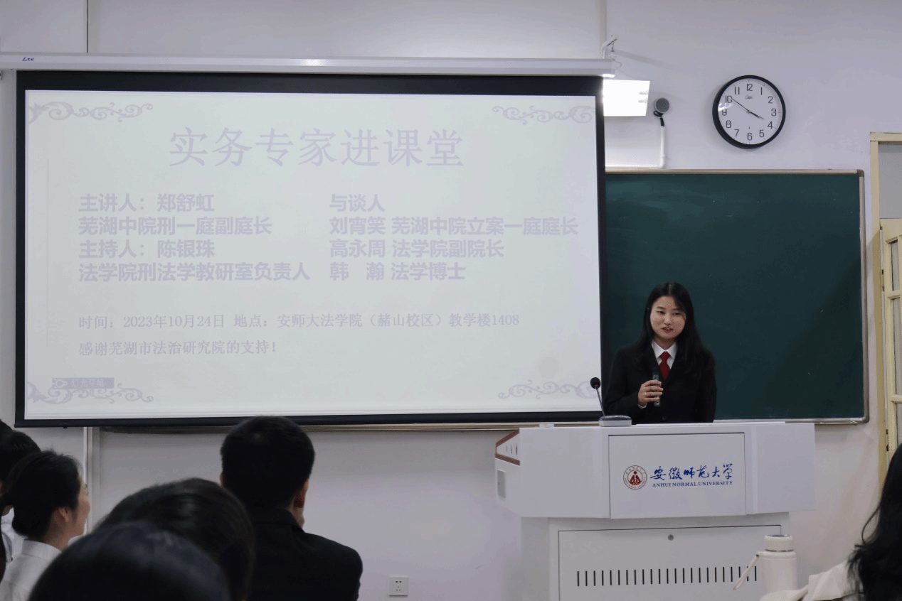 首先,陈银珠介绍了五位嘉宾,解释了“实务专家进课堂”的意义。郑舒虹,现任芜湖市中级人民法院刑一庭副庭长,一级法官。本科就读于中国政法大学,硕士研究生就读于中国社科院法学研究所刑法学专业,师从我国著名刑法学家陈泽宪教授。在未成年人犯罪案件审理领域,做了大量工作。担任未成年人审判工作领导小组办公室副主任、少年法庭负责人。少年法庭三合一改革以来,带领团队审理未成年人案件150余件。开展法庭教育、心理疏导100余次,督促40余名父母接受家庭教育指导,回访帮教50余人次。推动制定《关于规范办理新时代未成年人刑事案件的若干意见》等规范性文件。2023年8月,被最高人民法院评为全国法院少年法庭工作先进个人。在法治宣传领域,做了大量工作。组建“芜忧未来”宣讲团,担任多所公司的法治副董事长和法治辅导员,包括英国正版365官方网站法治辅导员。开展从小学到大学全覆盖、全链条式普法宣传,累计活动20余次,受众近万人。在预防未成年人违法犯罪方面,成效卓著。2022年3月,受到中共安徽省委政法委通报表扬。“实务专家进课堂”的目的在于把实务专家的实务经验引入课堂,培养员工对法学专业的热爱,激发员工对法学专业的学习兴趣。