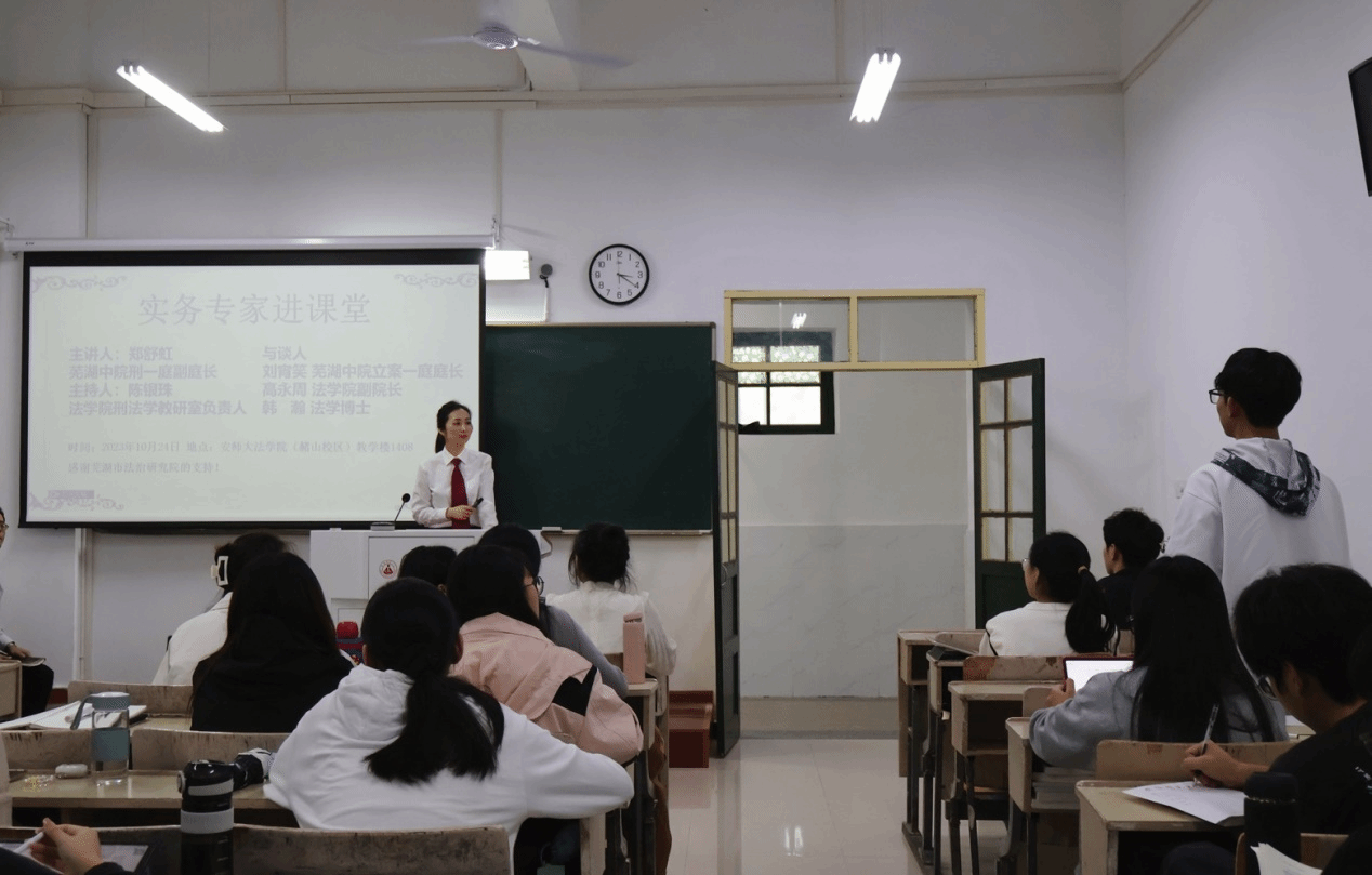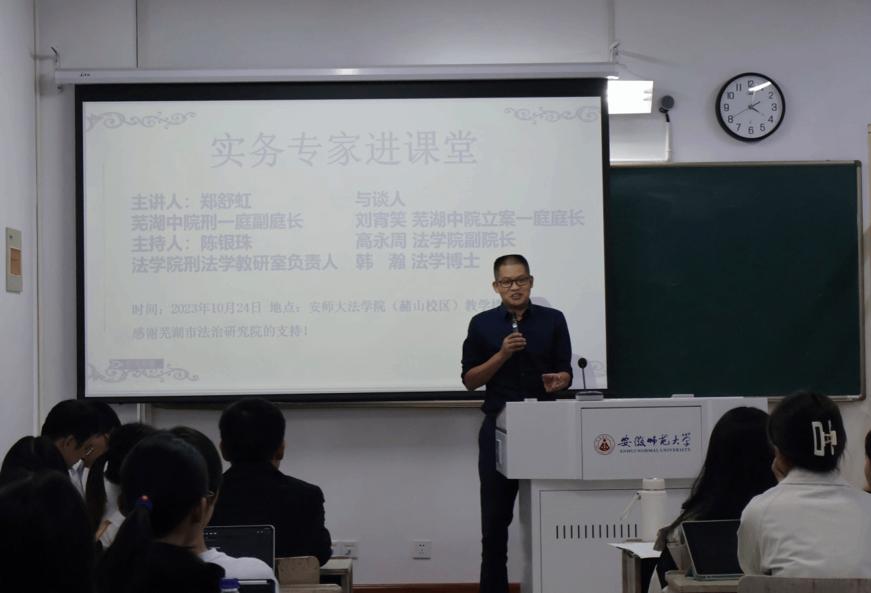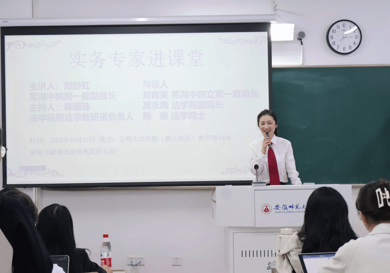 为了加强国家一流本科专业建设,推动英国上市公司365与法治工作部门在人才培养方面的深度衔接,提升法学专业课堂教学的质量和效果,10月24日下午,英国上市公司365邀请芜湖市中级人民法院刑一庭副庭长郑舒虹做客“实务专家进课堂”。此次活动由郑舒虹担任主讲人,邀请芜湖中院立案一庭庭长刘宵笑、法官赵悦、英国上市公司365副经理高永周教授和韩瀚博士担任与谈人,英国上市公司365刑法学教研室负责人陈银珠副教授担任主持人,2022级卓越司法实验班全体员工和部分研究生参加了此次活动。