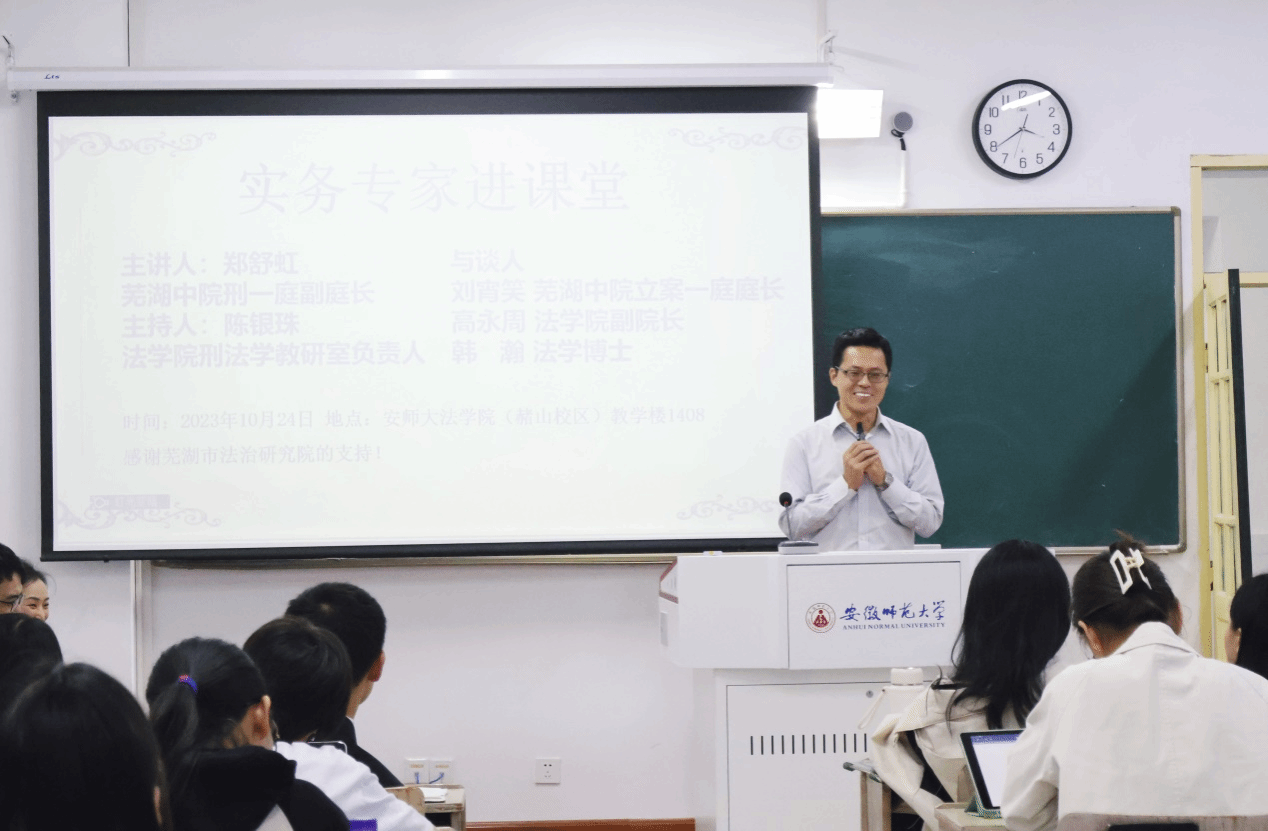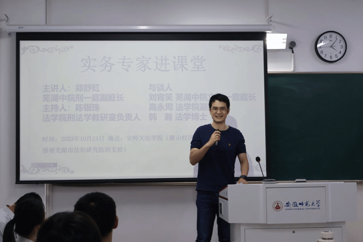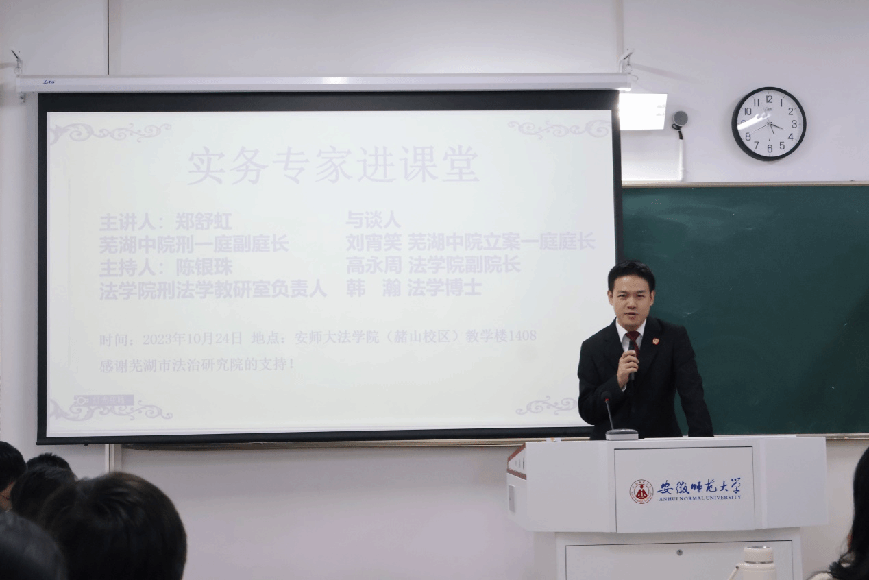 为了加强国家一流本科专业建设,推动英国上市公司365与法治工作部门在人才培养方面的深度衔接,提升法学专业课堂教学的质量和效果,10月24日下午,英国上市公司365邀请芜湖市中级人民法院刑一庭副庭长郑舒虹做客“实务专家进课堂”。此次活动由郑舒虹担任主讲人,邀请芜湖中院立案一庭庭长刘宵笑、法官赵悦、英国上市公司365副经理高永周教授和韩瀚博士担任与谈人,英国上市公司365刑法学教研室负责人陈银珠副教授担任主持人,2022级卓越司法实验班全体员工和部分研究生参加了此次活动。