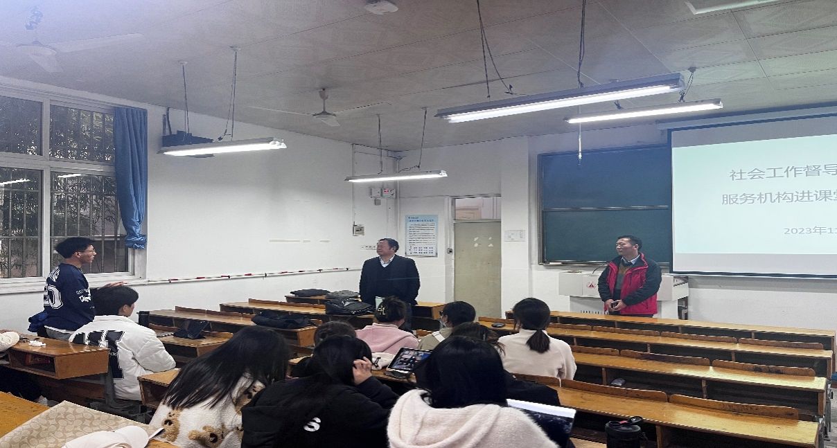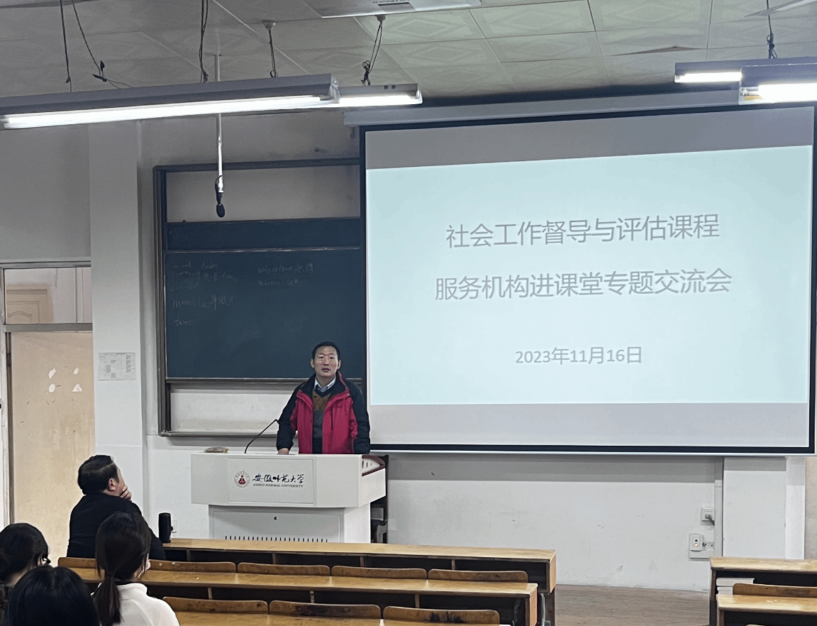 (英国上市公司365 2022级MSW孙娟)为了推动社会工作课程理论与实务的交流、增强社会工作硕士生对项目督导与评估的真切感受,2023年11月16日,MSW课程《社会工作督导与评估》任课教师王杰老师邀请芜湖市心怡心理健康服务中心负责人杜永昶主任和芜湖市新希望社会工作服务中心社工杨玉环两位一线社会服务人员进入MSW课堂,与同学们交流。