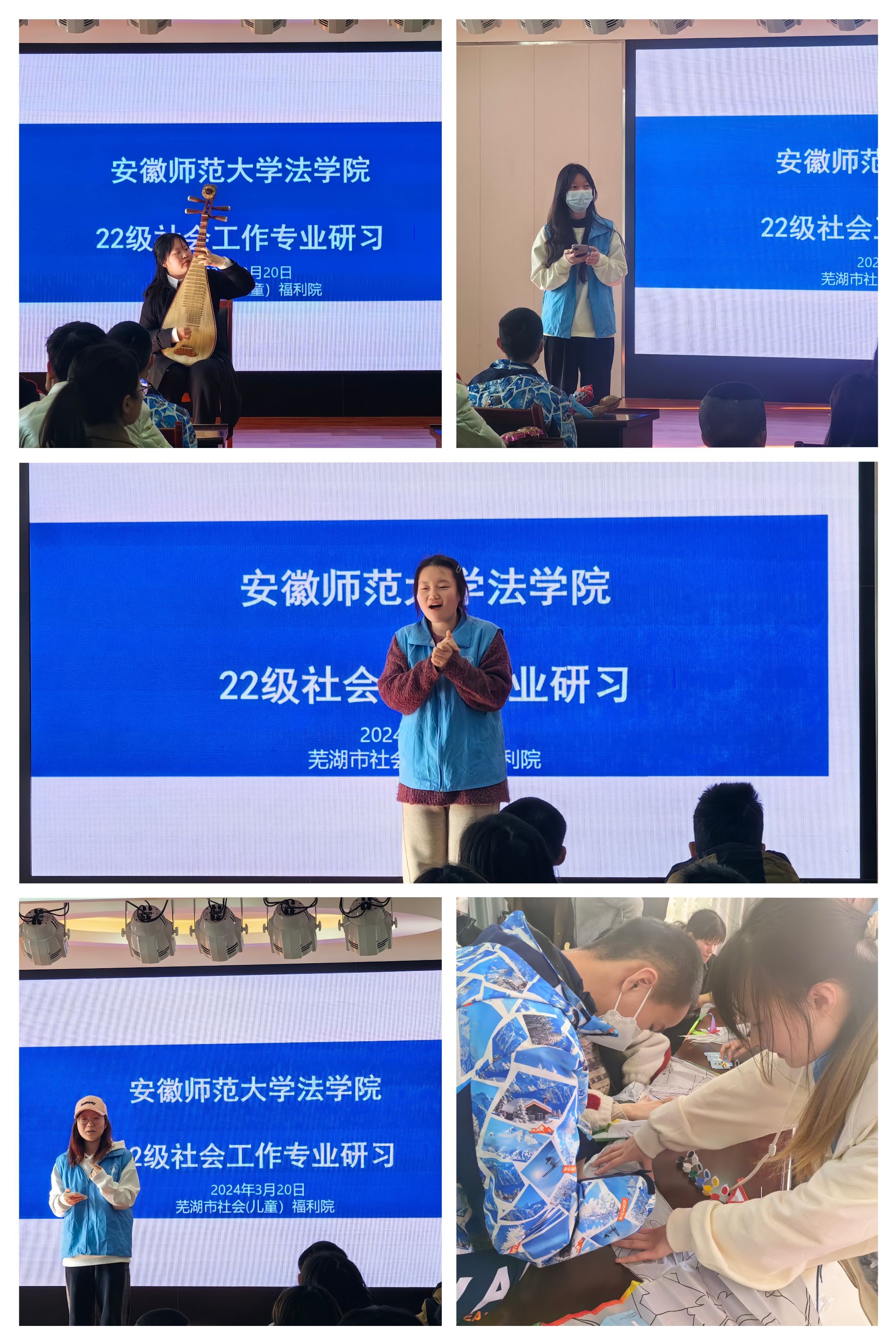 研习过程中,芜湖市社会(儿童)福利院经理张翠就院内情况向同学们做详细介绍,张经理强调:“福利院的大小事务都离不开社工的协调与帮助,作为福利院与社会之间的桥梁,社工链接为福利院链接各种资源,例如就业的资源、爱心资助的资源等等。在福利院中,社工占据的地位是十分重要的中坚力量。”伴随着张经理的讲述,22级社工同学也开始了精心准备的节目表演。表演中,同学们与福利院的孩子们积极互动,现场氛围轻松愉快,与孩子们的近距离接触也让同学们进一步认知到社会工作专业的意义。