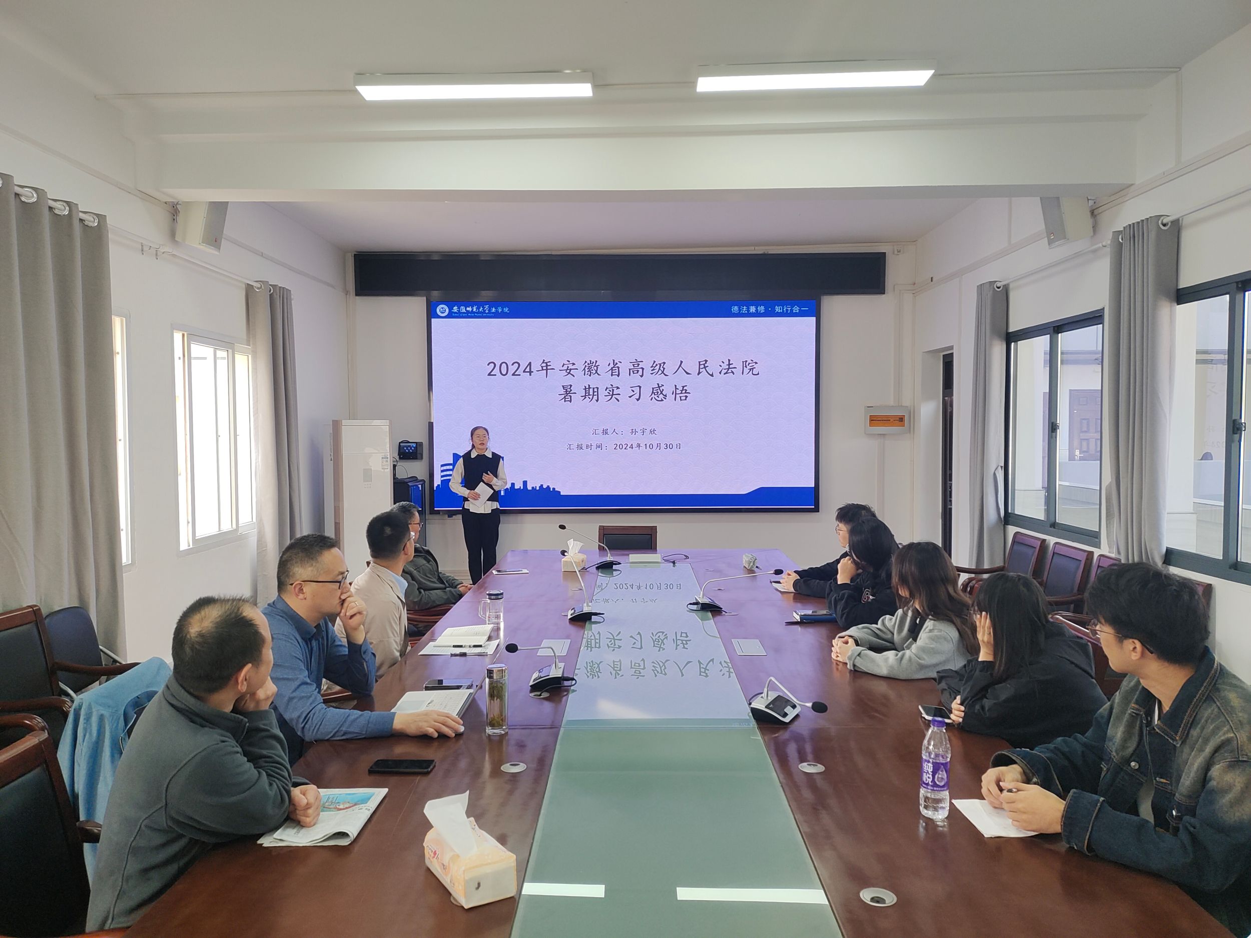 各实习组长依次进行实习总结。分别从小组人员基本情况、工作完成情况、实习内容和感悟、实习总结提交情况等方面全面进行了汇报。实习生的日常不仅仅需要扎实有序做好准备工作、亲身实地参与庭审,更需要精益求精打磨裁判文书、一字一句撰写案例分析、用心细心记录会议访谈。大家纷纷表示在实习过程中收获颇丰,既提升了法学专业实务能力,又看到了自身不足和努力方向,为成为一名高素质的法律人打下了重要基础。