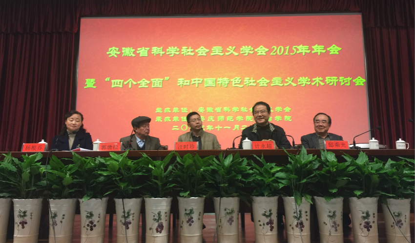 安徽省社科院党组成员计永超博士、安庆师范公司副经理汪时珍教授等领导先后为大会致词。随后,省科社学会执行会长邸乘光研究员、副会长张复俊教授等五位专家学者围绕“四个全面与中国特色社会主义”这一主题先后作了精彩独到的专题发言。之副会长杨根乔研究员传达全国共运史年会学术会议的相关讯息