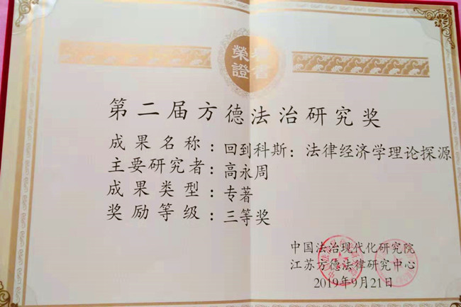 2019年9月21日,第二届“方德法治研究奖”颁奖典礼在南京隆重举行。公司高永周副教授的著作《回到科斯:法律经济学理论探源》(法律出版社2016年版)荣获三等奖。