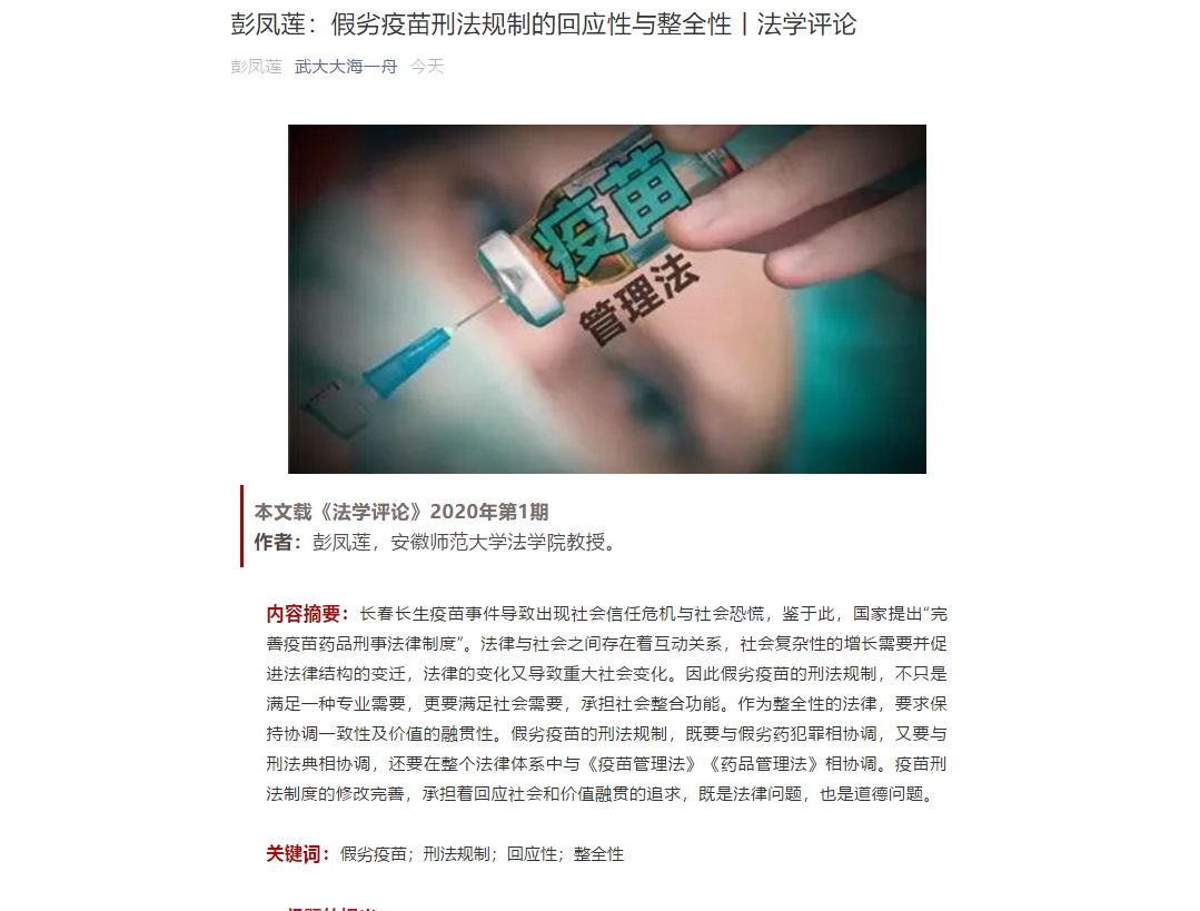 《法学评论》2020年第1期刊发表了彭凤莲教授《假疫苗刑法规制的回应性与整合性》一文。