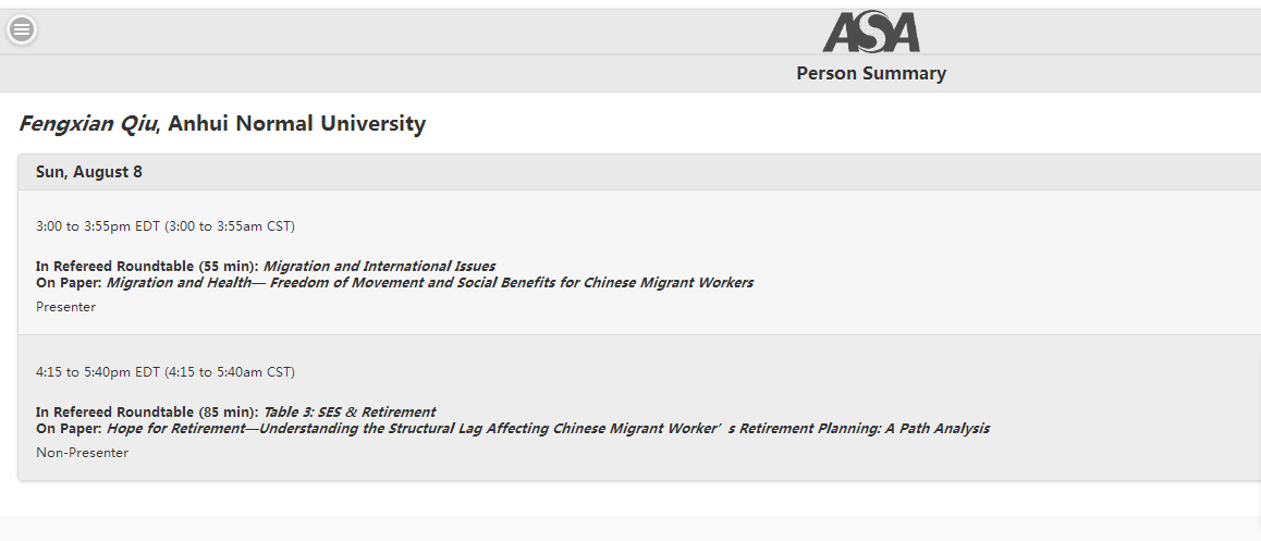 本网讯(英国上市公司365)2021年8月6日至8月11日,公司社会工作专业教师仇凤仙副教授应邀参加了在美国举行的第116届美国社会学年会(The Annual Meeting of the American Sociological Association,ASA),由于疫情影响,本次年会以线上虚拟方式举办,年会主题为“解放社会学:迎接杜·波依斯的挑战”。