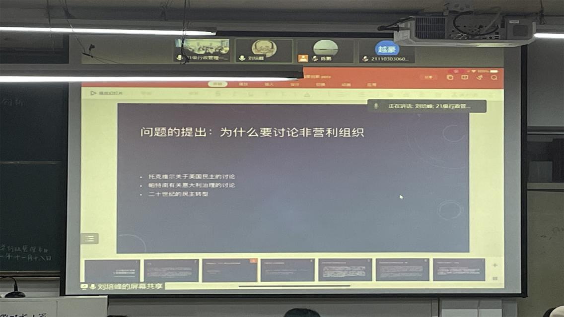 刘培峰教授首先从中国历史上的慈善机构着手,介绍了非营利组织法律制度改革和中国NGO的发展历程、自主治理。其次,刘培峰教授针对慈善法的执法检查与修订、非盈利组织法律制度的特点和基本格局等问题作出深入的解读,对中国社会组织的法律制度创新发表了自己独特的观点。同时,他认为中国非盈利组织以自我构建和自我发展完成自身使命,发挥了不可或缺的积极社会作用,例如慈善新形态水滴筹、希望工程提升了社会对教育的关注度等等。刘培峰教授鼓励同学们通过加入社团组织等方式积极投入到社会当中去,打好人生基础,实现自身成长。