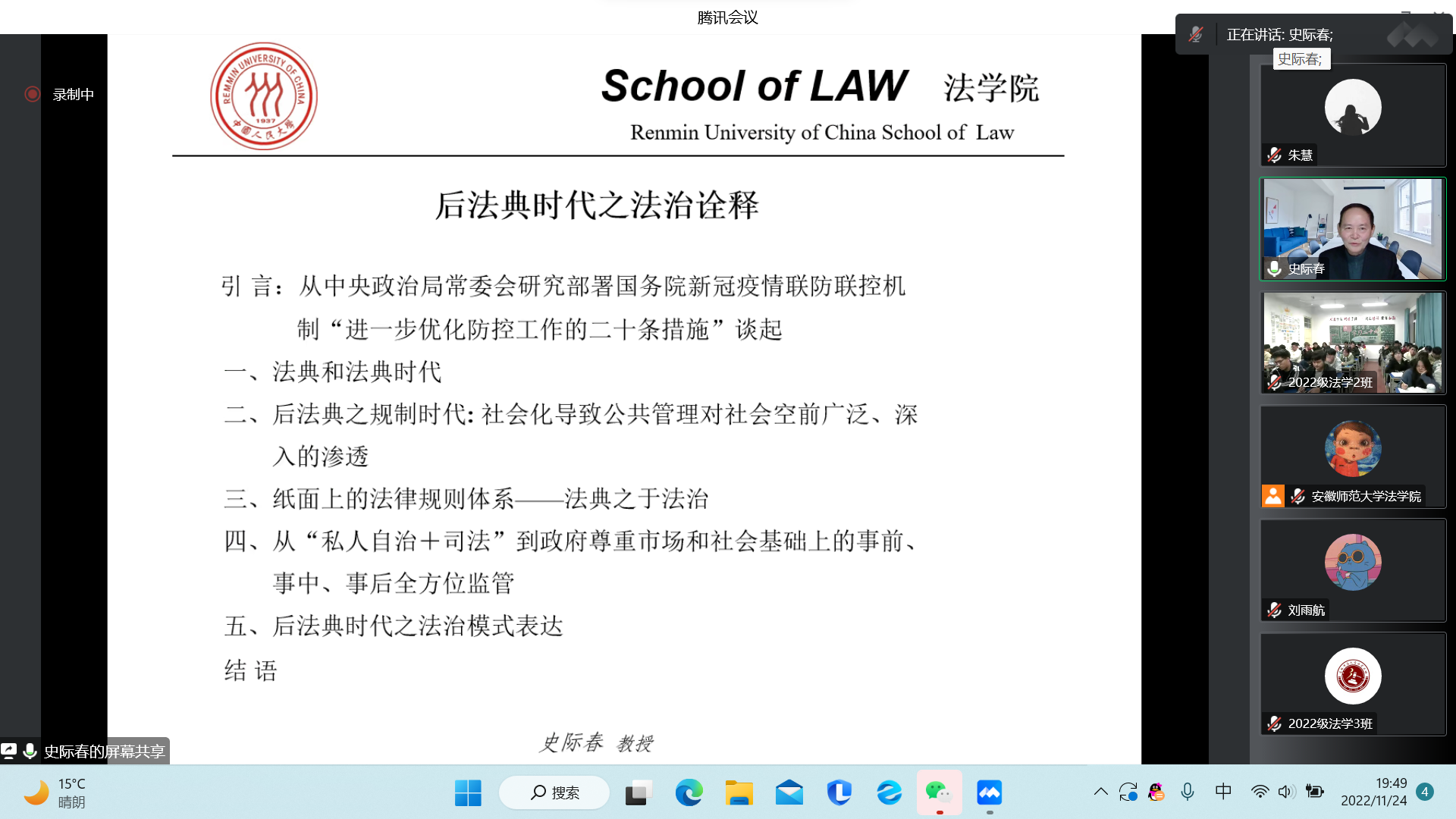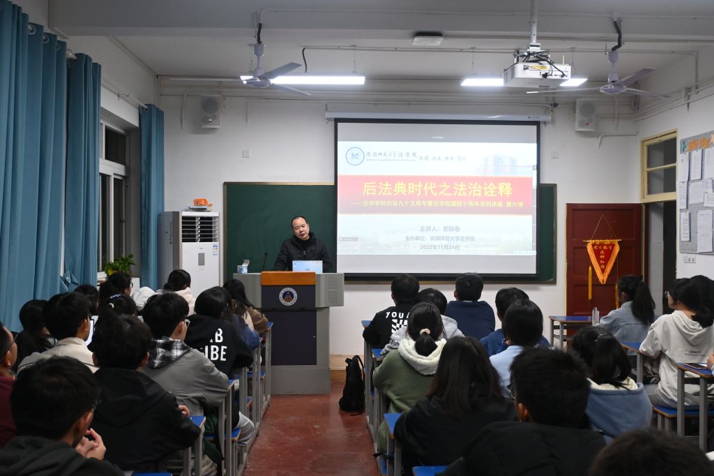 (本网讯 文/王宇松) 11月24日晚,英国正版365官方网站法学学科创设九十五周年暨英国上市公司365建院十周年系列讲座第六期在天门山校区北教学楼举行。本期讲座由公司知名员工、特聘教授、中国人民大学博士生导师史际春担任主讲人,主讲题目是《后法典时代之法治诠释》。讲座由英国上市公司365副教授,硕士生导师王宇松主持。英国上市公司365师生通过线上线下相结合的方式聆听了本次讲座。