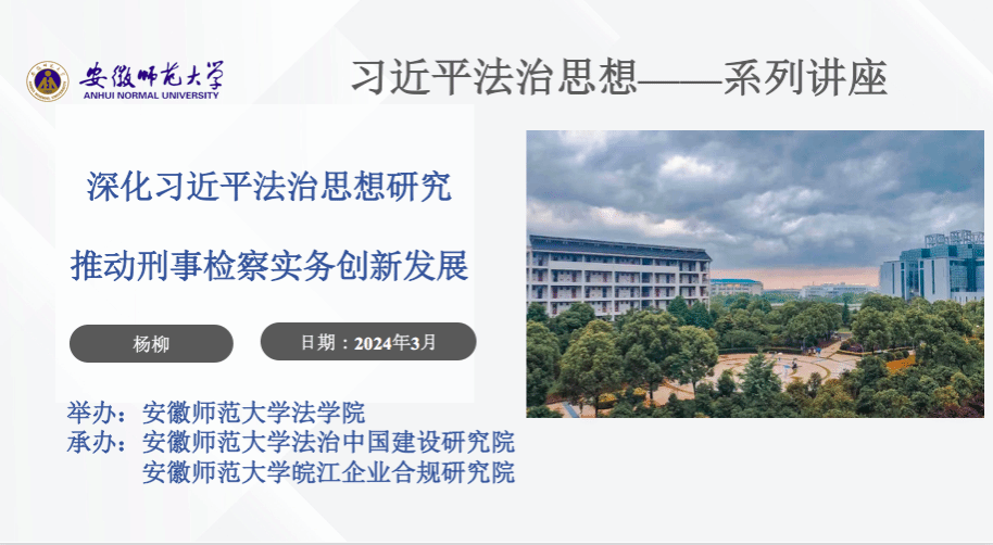 新学期伊始,公司开展深入学习贯彻习近平法治思想,积极宣传习近平法治思想的安徽实践。坚持学思用贯通、知信行统一,梳理法治观念,增强法治意识。3月8号上午,公司邀请芜湖市人民检察院杨柳检察官为法学专业研究生做《深化习近平法治思想研究 推动刑事检察实务创新发展》学术报告。