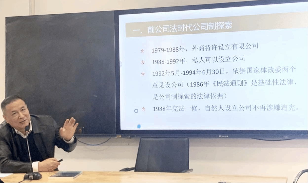 在主讲环节,黄辉结合自己30年学习和运用《公司法》的经验,从《公司法》的历次修订的视角介绍了我国社会主义市场经济体制建设进程。第一,改革开放之后,我国进入前公司法时代,公司制的探索阶段。1986年《民法通则》是基础性法律,是公司制探索的法律依据。1988年《宪法》修改之后,自然人设立公司不再涉嫌违宪。第二,我国1993年《公司法》的出台标志着我国步入公司法时代。他作为安徽省国有企业公司制改建过程的亲历者和推动者,分享了历次《公司法》的修订和修正对企业产生的影响和企业是如何不断贯彻《公司法》的精神。第三,为应对不断涌现的问题和营商环境变化,新《公司法》进行了重要变革。实质修改主要在有限责任公司的注册资本期限缴足,公司监督机构自主选择,股东知情权变革延伸拓展等方面。第四,落实新《公司法》,完善市场化法治化国际化营商环境。要坚定不移推进市场主体的合规决策诚信经营,发挥人民法院在公司案件中化解矛盾的作用,弘扬企业家精神。