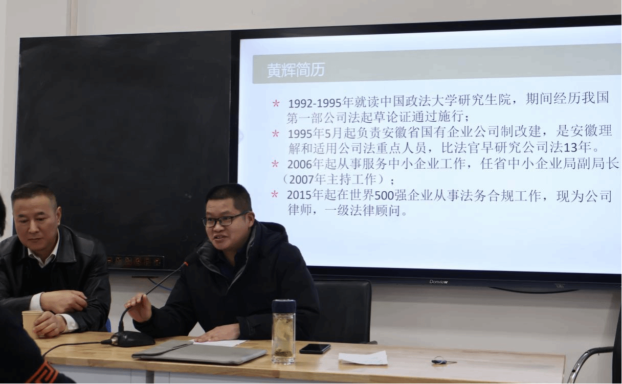 活动伊始,高永周介绍了本次活动的嘉宾和《公司法》修订的背景。黄辉,现任安徽海螺集团法律事务室监督员,一级法律顾问。硕士研究生就读于中国政法大学研究生院。1995年5月起负责安徽省国有企业公司制改建。2006年起从事服务中小企业工作,任省中小企业局副局长。2015年起在世界500强企业从事法务合规工作。我国《公司法》自1993年12月29日公布以来,已历经两次修订和四次修正。2023年12月29日,新修订的《公司法》经十四届全国人大常委会第七次会议修订通过,自2024年7月1日起施行。《公司法》的修订对于完善中国特色现代企业制度、推动经济高质量发展具有重要意义。