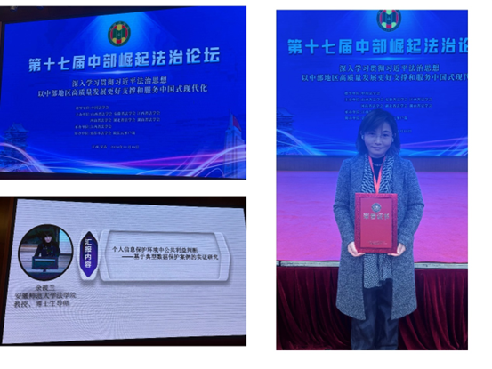 公司教师余筱兰受芜湖市法学会、安徽省法学会推荐,作为获奖论文代表在此次论坛作报告。她的论文题为《个人信息保护环境中公共利益判断——基于典型数据保护案例的实证研究》,从五个方面展开:公共利益在个人信息保护中的忽视现状;国际典型案例中公共利益判断的难点;个人信息与公共利益保护的法律框架;提出“三原则+四检测”判断标准;该标准的实际应用。余老师结合国际案例评析、理论设计及实践检验,深入论证了其公共利益判断标准。