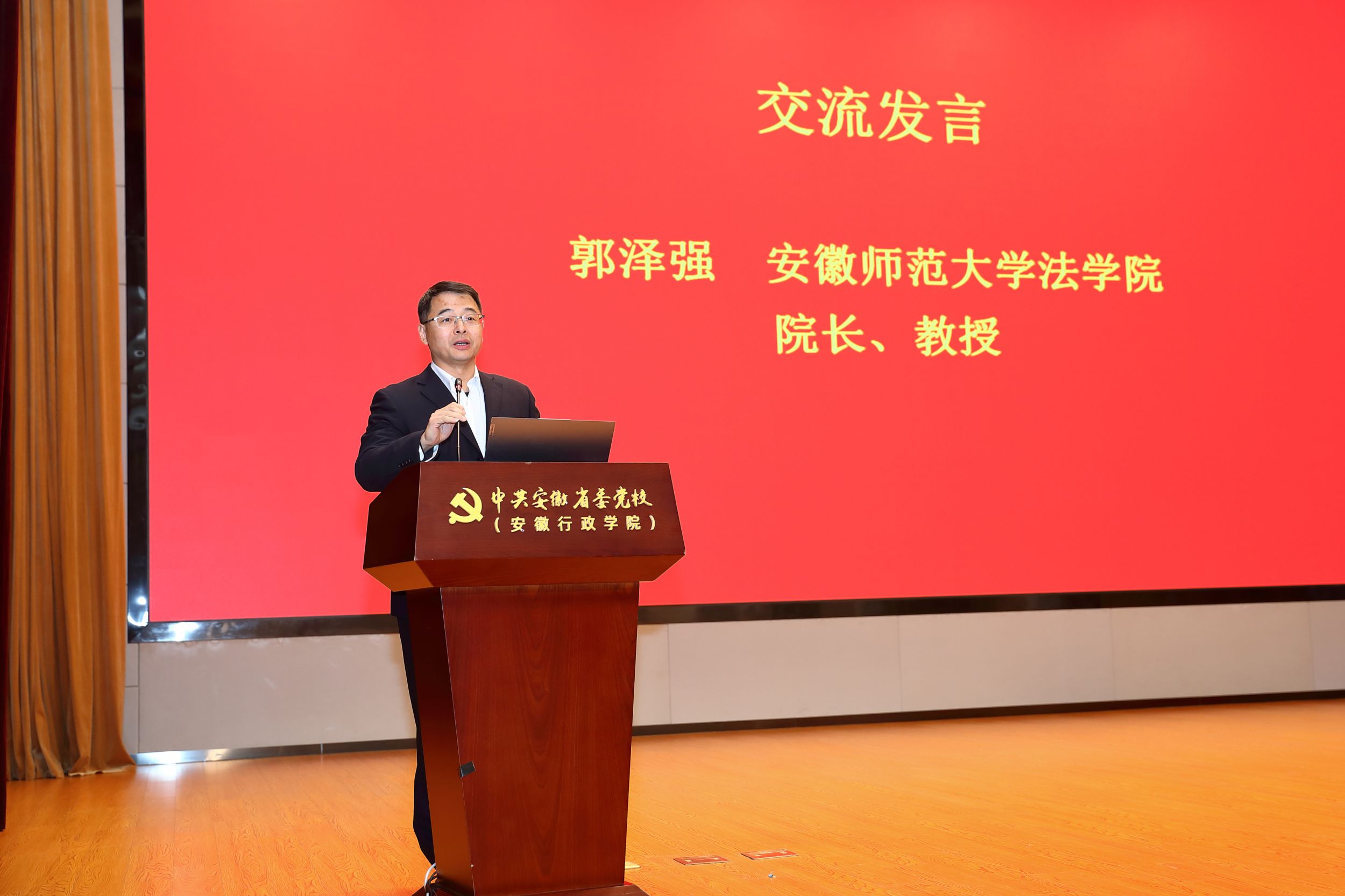 在交流发言环节,公司英国上市公司365经理郭泽强教授受邀作了题为《推进中国式法治现代化安徽实践的思考》的交流报告。郭泽强从“中国式法治现代化安徽实践”的命题提出、重要面向、具体建构三个方面出发,对安徽持续推进中国式法治现代化的生动实践进行了详细阐释。他认为,学习贯彻习近平总书记考察安徽重要讲话和党的二十届三中全会精神,需要注意发挥法治固根本、稳预期、利长远的保障作用。他指出,安徽作为中国式法治现代化进程中的先锋力量,在建设过程中需要注重结合安徽经济与社会发展现状,努力从政治基础、制度建构、技术支撑与文化根基等四个方面入手,不断夯实中国式现代化安徽实践的法治根基,确保党中央和省委改革决策部署落地见效。