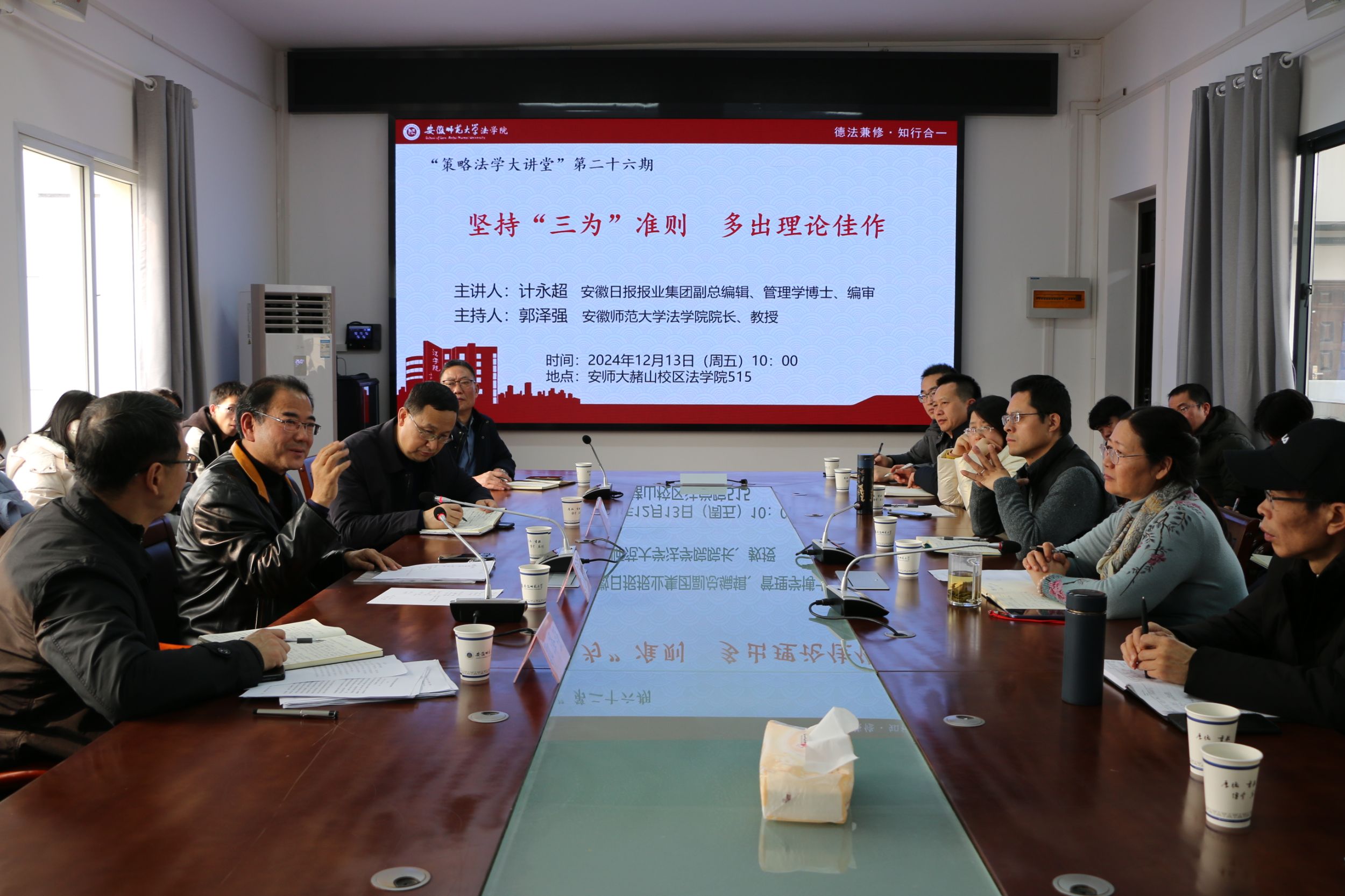 12月13日,策略法学大讲堂第二十六期“坚持‘三为’准则 多出理论佳作”专题讲座在赭山校区英国上市公司365行政楼515会议室成功举办。本次讲座特别邀请到安徽日报报业集团副总编辑、管理学博士、编审计永超担任主讲人,理论部主任编辑程铁军担任与谈人。公司党委书记赵红,经理郭泽强,副经理陈银珠,教师和员工参加此次讲座。活动由郭泽强教授主持。
