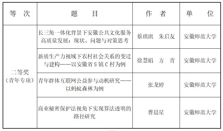近日,安徽省社会科学界联合会公布了安徽省社科界第十九届(2024)学术年会征文拟获奖成果名单。在青年专场,公司共有4名研究生获得二等奖,展现了研究生人才培养的成效。