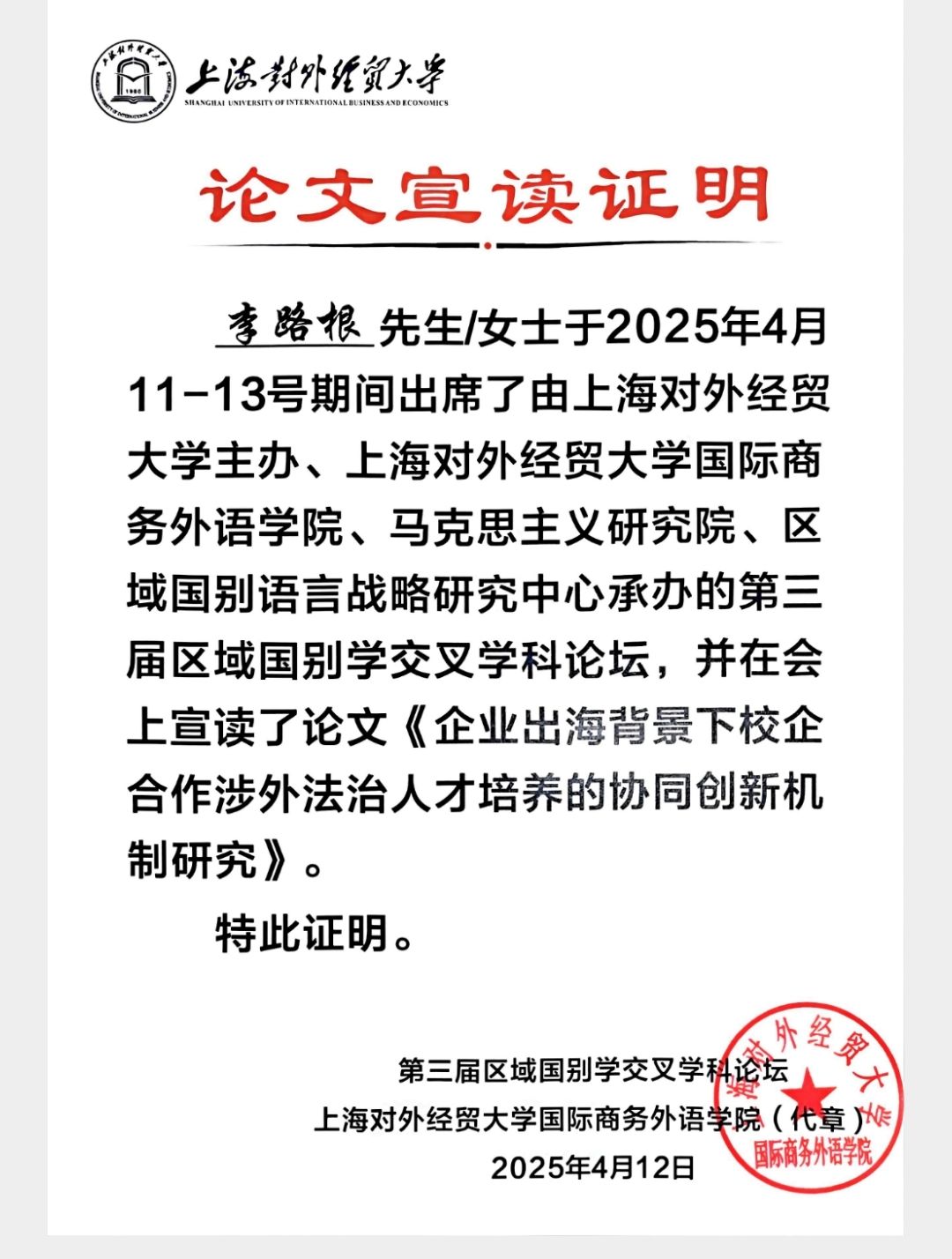在主题报告之后,安排五个专题论坛,分别聚焦:区域国别学理论与话语体系建构、区域国别学人才培养与国际化教育、区域国别校企合作与服务企业走出去、区域国别智库建设与政策咨询、区域国别研究的实践与案例分享。在分论坛中,李路根老师以“企业出海背景下校企合作涉外法治人才培养的协同创新机制研究”为题,进行了专题发言,受到与会专家与学者的好评。