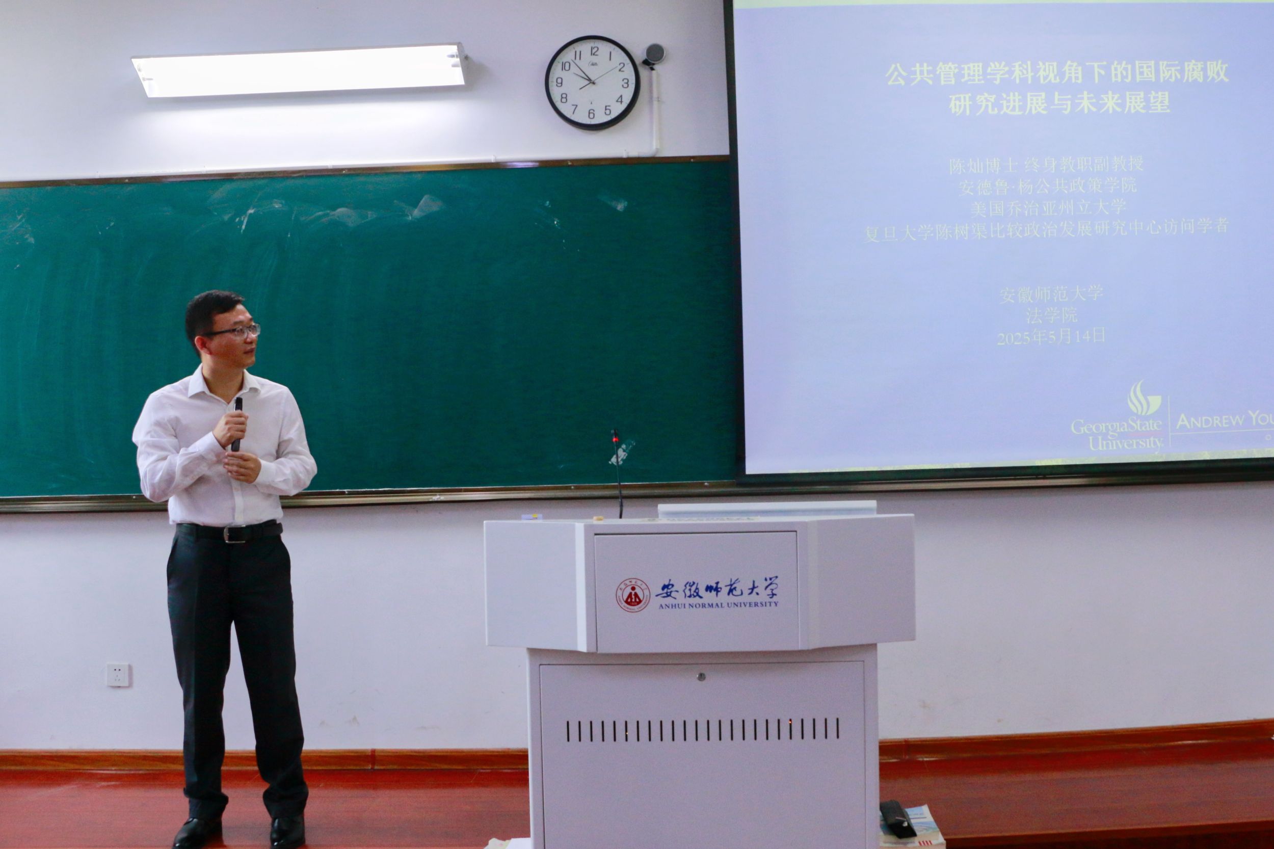 5月14日,“公共管理学科视角下的国际腐败研究进展与未来展望”专题讲座在赭山校区教学楼1311成功举办。本次讲座特别邀请到美国乔治亚州立大学终身教职副教授、博士生导师陈灿担任主讲人,英国上市公司365教授、博士生导师金太军担任主持人,英国上市公司365师生代表参加。