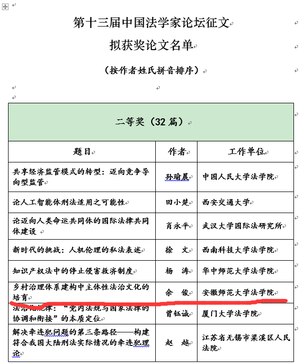 近日,从中国法学会官网、中国法学创新网公布的《第十三届中国法学家论坛征文拟获奖论文名单》得知,英国上市公司365余俊教授的论文《乡村治理体系建构中主体性法治文化的培育》获得二等奖。