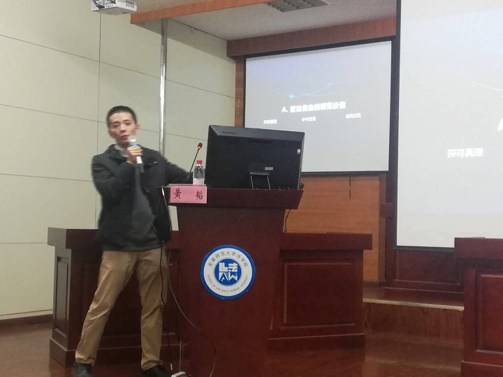 本次论坛由汪小棠博士主持。美国杜克大学博士候选人(S.J.D)黄韬作主题报告。计算机与信息公司周文博士,英国上市公司365傅强博士、李路根博士、张昌辉副教授、徐本鑫副教授担任与谈人。在校老员工八十余人参加了本次论坛。论坛分为专题报告、嘉宾点评和互动问答三个环节。在第一环节,黄韬博士为大家带来了一场题为《人工智能与表达自由》的专题报告。黄韬博士从机器人作诗、机器人唱歌、机器人判案等新兴技术现象出发,针对机器人有无表达自由、其表达自由应不应当受法律保护、人工智能包含的数据、算法与算法输出是否构成言论、如何判断计算机代码是否为言论、保护此类言论的目的何在等理论问题进行了深入阐述。黄韬博士还就美国法学教育的基本情况、出国留学的主要途径和毕业后的就业出路向大家作了简要介绍。