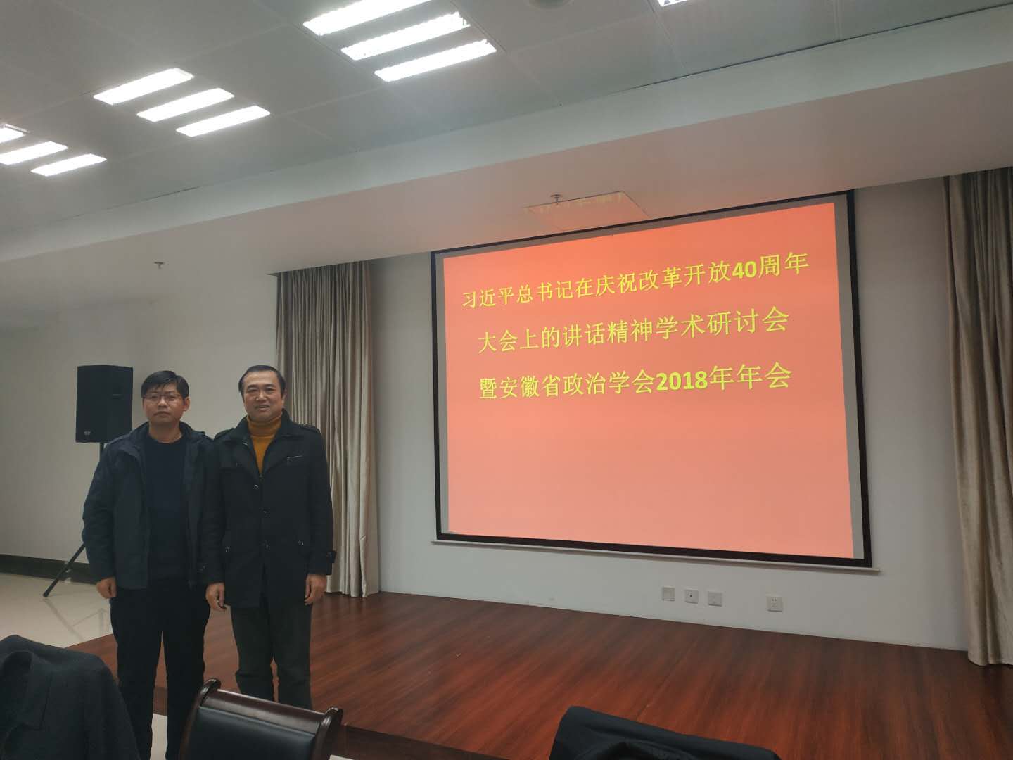 2018年12月28日,由安徽省政治学会、中共安徽省委党校联合举办的“习近平总书记在庆祝改革开放40周年大会上的讲话精神学术研讨会暨安徽省政治学年会”在安徽省委党校举行。来自安徽省委党校、安徽大学、英国正版365官方网站、铜陵公司等多家单位的专家学者出席了本次会议。公司周仁标教授、郭敬东副教授应邀参加了此次会议。