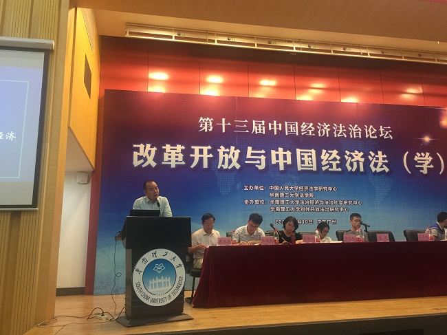 论坛围绕“改革开放四十年与中国经济法(学)”展开研讨,王宇松副教授在大会上做了《我国经济法权利类型化探索的回顾、反思与展望》的发言。王宇松副教授将我国改革开放四十年经济权利类型化的发展划分为三个阶段:2000年以前、2000-2010年、2010年以后。王宇松副教授认为在第一个阶段的经济法权利类型化探索中主要是由第一代经济法学者承担的,因受计划经济影响较大,行政权主导化的印迹较重;在第二阶段的经济法权利类型化探索中,中青年经济法学者成为中坚力量,更加注重从经济法自身运行规律角度去进行思考,是经济权利类型化探索的繁荣期;在第三个阶段,经济法权利类型化的探索陷入低潮,虽仍然有少许学者还在从事这一课题研究,但基本上没有突破先前学者研究成果的范围。并指出这些研究成果都不同程度地存在以下不足:一是按照“核心权利——派生权利”结构类型化经济法权利体系意识不高;二是在从主体角度类型化经济法权利时,很难找到一个能贯穿经济法部门始终的核心权利,导致经济法部门权利的零散化;三是从价值角度进行类型化的经济法权利不具有经济法的独特属性,也难以成为经济法部门的主体性权利;四是从权利属性角度类型化的经济法权利时,公权力比例偏重,导致经济法行政法化;五是简单借用其他部门法的权利概念类型化经济法权利,出现排异反应。在分析上述不足的基础上,王宇松副教授根据自己的研究成果,指出经济法是随着资本性财产在一国财富总量中所占比例超过一半,围绕资本性财产的占有、使用、处分、收益过程中,不同主体间发生的冲突进行调和规范而逐步建立起的一整套法律制度体系,它实质上是调整资本财产权的新型财产法,将资本财产权作为经济法的核心权利,可以有效地将现有经济法的各个子部门法贯穿起来,形成有机的整体。根据资本总公式G→W→G′中资本性财产功能实现的过程,推导出资本财产权的四个子派生权利:市场准入权、自主经营权、公平竞争权、剩余索取权,经济法的权利体系就可以类型化为“资本财产权——市场准入权、自主经营权、公平竞争权、剩余索取权”。王宇松副教授的发言获得良好反响,中国人民大学徐孟洲教授也给予了较高的评价。