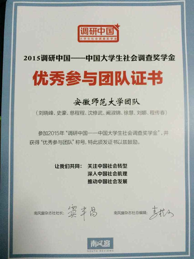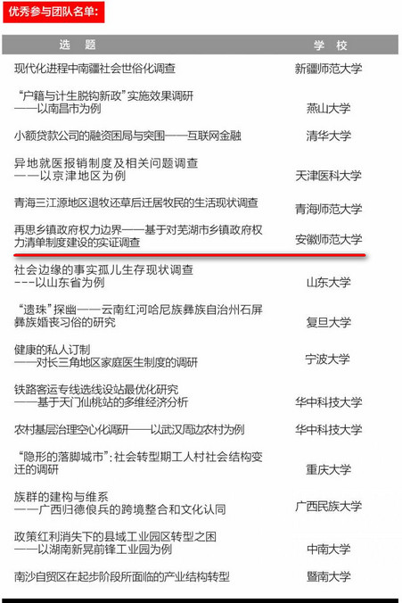 本年度“调研中国”项目共收到来自全国129所高校,近1500支团队的报名,突破历年参与人数记录。经过层层选拔,刘晓峰老师所指导的项目《再思乡镇政府权力边界——基于对芜湖市乡镇政府权力清单制度建设的实证调查》入围最后的前30名,并荣获“优秀参与团队”奖,充分展示了公司本科生积极观察、善于思考当前社会热点问题的良好精神风貌。这也是英国上市公司365近年来积极开展本科生实践能力和学术能力教育的重要成果。