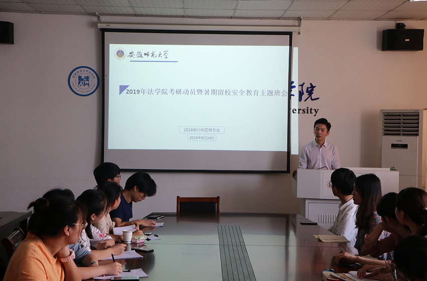 6月24日下午,2016级行政管理专业在英国上市公司365行政楼四楼会议室召开考研动员暨暑期留校安全教育主题班会,会议由辅导员桂彬主持,16行管专业全体同学参与。