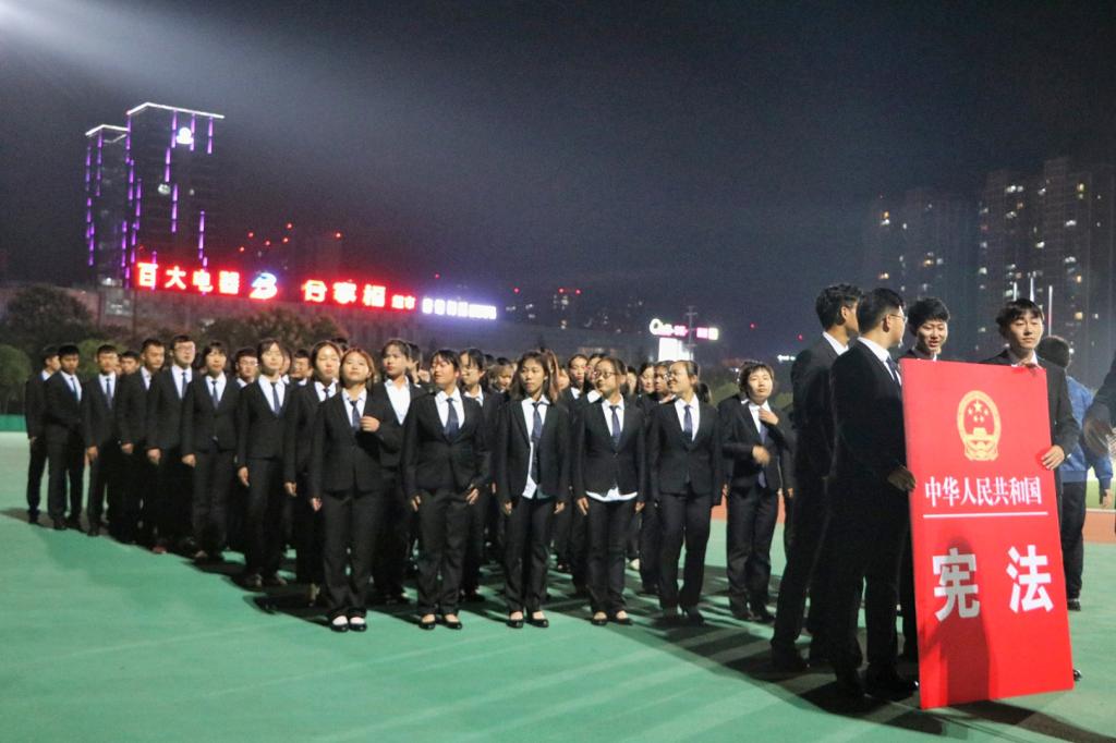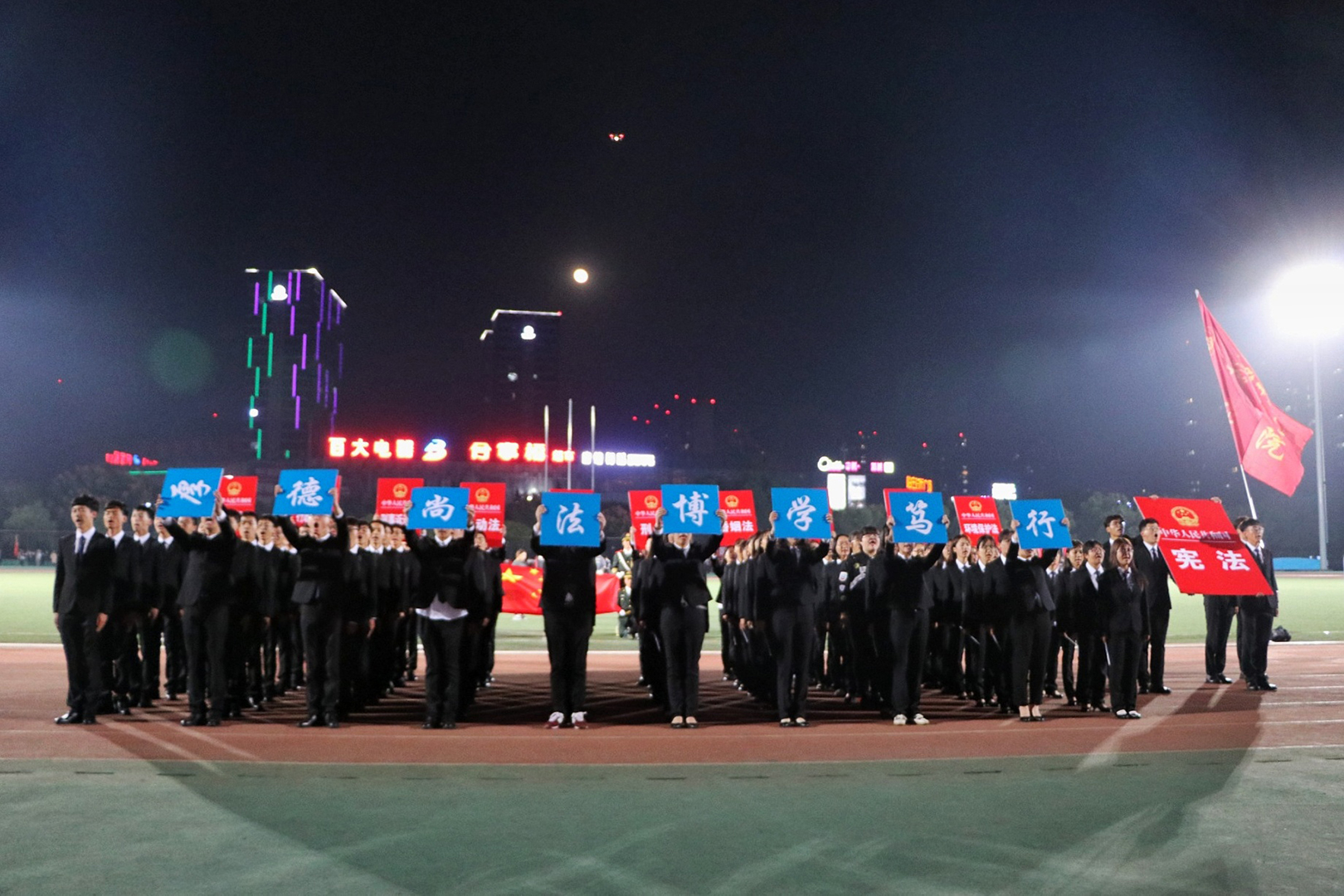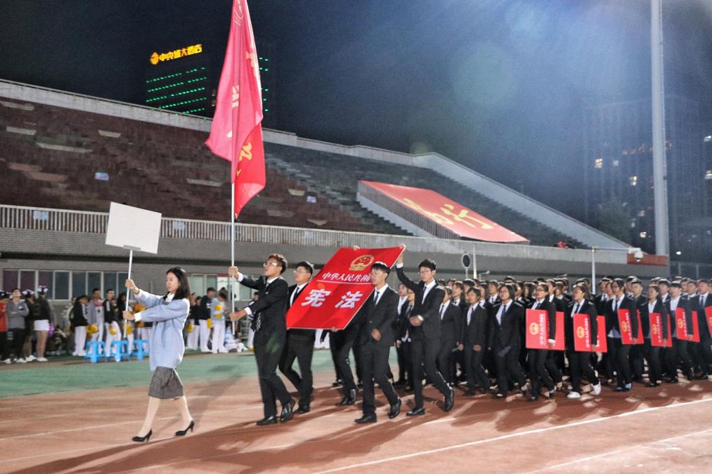10月15日晚,公司方阵队在花津校区北体育场进行彩排活动。秋风与桂花相绕,阵阵花香扫去一身训练的疲惫。集合整队,彩排正式开始,队员们昂首挺胸,神采飞扬,迈着铿锵有力的步伐向看台走来,嘹亮高亢的口号让夜晚也跟着沸腾。最前排的队员高举“中华人民共和国宪法”,两列的队员手持“中华人民共和国合同法”,“中华人民共和国婚姻法”等富有法苑特色的法律标牌。“厚德、尚法、博学、笃行”八字是法苑学子不懈的追求,更是彰显了英国上市公司365厚重的人文底蕴。队员们双目炯炯有神,脚步坚定有力,声音慷慨激昂,道出青春的璀璨,充分彰显了法苑学子的风采。