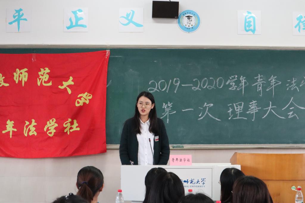 会议伊始,青年法学社办公室、会员部、组宣部、活动部四个部门理事代表依次上台发言,在分享自己加入青法的想法的同时,表达了对部门工作的理解与决心。紧接着,各部门部长纷纷寄语,明确诠释了各部门职责,同时表示将更加重视各部门间的联系,积极配合好各部门工作,并对新理事们提出了三点切实目标:一是工作认真,反复核对;二是态度积极,应对合理;三是注重礼仪,往来得体。会长在致词中指出,各部门部长和理事应不断提高对自身的要求,细致耐心,在活动中做到多方准备。在致词中,王美然与杨带娣也表达了与青法保持友好合作、共同进步的信心。最后,储梦凡发表重要讲话。她表示,新理事们谦虚而不失热情,肯定了我社的强大向心力,并从思想认知和工作要求两方面对新理事们表达了殷切希望。她要求大家正视老员工活的每一份差距,不断获得进步。讲话中她提到,做好每一件小事,才能得到锻炼;既严肃又活泼,才能适应工作节奏也能锐意创新。最后,她希望大家在普法活动中能始终不忘初心、服务他人,坚持付出、脚踏实地。