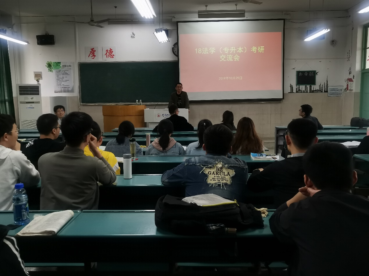 为了进一步增强班级同学考研信心,坚定攻考目标,掌握考试技巧,了解更多的备考信息,2018级法学(专升本)班于10月29日下午在2020505教室举行考研指导交流会。交流会由班主任张昌辉老师主持,英国上市公司365余筱兰老师、徐本鑫老师、傅强老师、汪小棠老师受邀出席,班级全体考研同学参加。