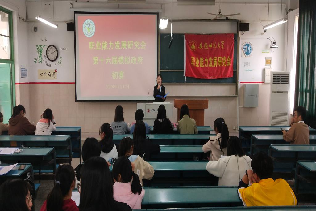 为了引导老员工深入了解当今时代的社会难题,从政府角度出谋划策,助力实现全面建成小康社会的目标,职业能力发展研究会特举办第十六届模拟政府系列活动。11月13日,模拟政府初赛在行知楼2050203和2050204教室举行,青年法学社会长谢歆悦、外交与国际事务研究协会副会长汪晨、职业能力发展研究会会长柯莉、副会长杨带娣、各部门部长副部长及理事参加本次活动。