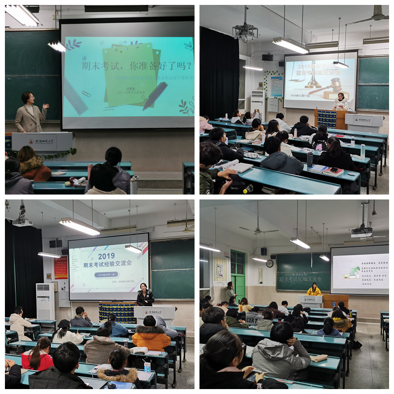 常言道:“行百里者,半九十”,最后一段路往往是最艰苦难行的。期末将至,为发挥朋辈引导作用,帮助同学们缓解考试焦虑,使大一新生尽快了解考试形式、掌握科学有效的复习方法。12月17日晚,2019级法学、行政管理专业分别邀请到了2018级卫苏、李小萍、吴梦婷、缪雪莹四位优秀员工代表为同学们进行期末考试经验交流。