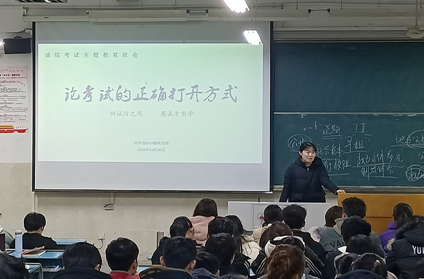 为加强学风建设,端正员工考试态度,2018级行政管理和法学一班积极响应公司建设考风考纪的号召,于12月27日下午在2010304教室开展考风考纪主题班会。本次班会由辅导员冯晟主持,全体同学认真听讲。