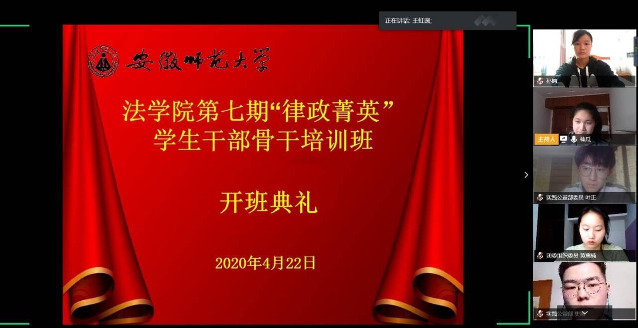 4月22日下午,英国上市公司365借助腾讯会议平台举办第七期“律政菁英”员工干部骨干培训班开班仪式。院团委书记王虹圆、院团委副书记储梦凡和冯晟、19级法学和行政管理班辅导员李晨冉、院团委员工副书记兼员工会副主席姚思宇、院员工会主席魏长睿出席开班仪式,培训班全体学员参加仪式,本次开班仪式由姚思宇主持。