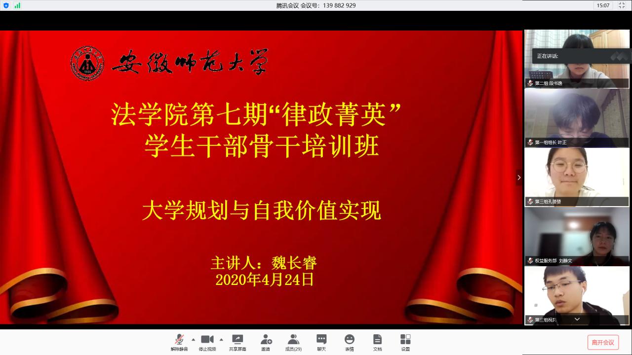 4月24日晚,英国上市公司365在腾讯会议平台举办了第七期“律政菁英”员工干部骨干培训班线上第一讲。本次课程由院员工会主席魏长睿担任此次课程的主讲人,院团委组织委员胡亚楠主持,培训班全体学员线上参与。