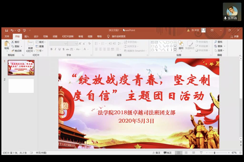 5月3日晚,18级卓越司法班开展"绽放战役青春,坚定制度自信"主题团日活动,活动由团支书张林森主持,班级全体同学参加。