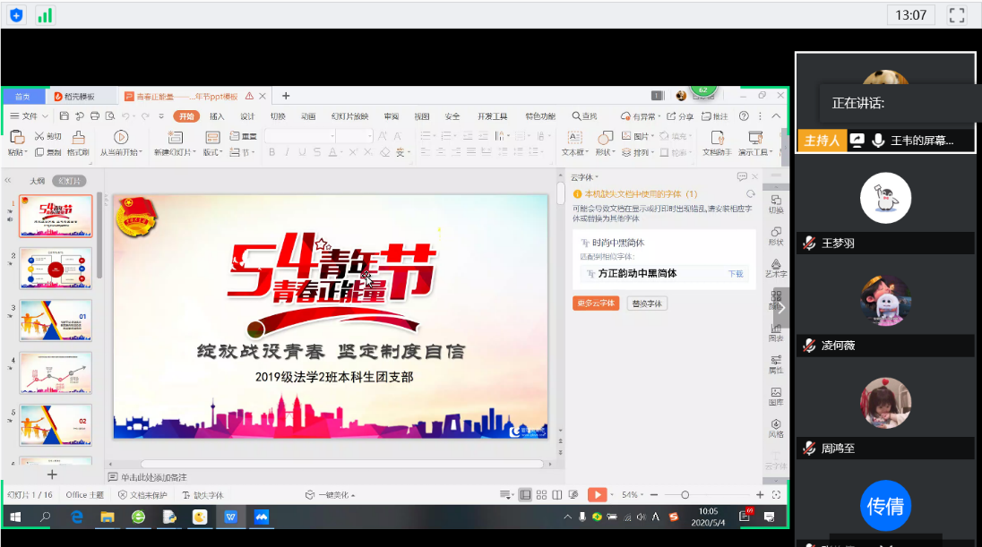 (本网讯 文/图 王梦羽)青春,不仅是年华,也是心境。青春,热血盖过怯弱,进取压倒苟安。青春,最惧怕的不是容颜衰老,而是丧失对生活的勇气。青春,不仅是一段难忘的历程,更是执着的追求!又是一年五四青年节,此刻,就是生命中最年轻的一刻。5月4日上午10点,2019级英国上市公司365法学二班全体同学借助腾讯会议app顺利开展了五四主题活动。