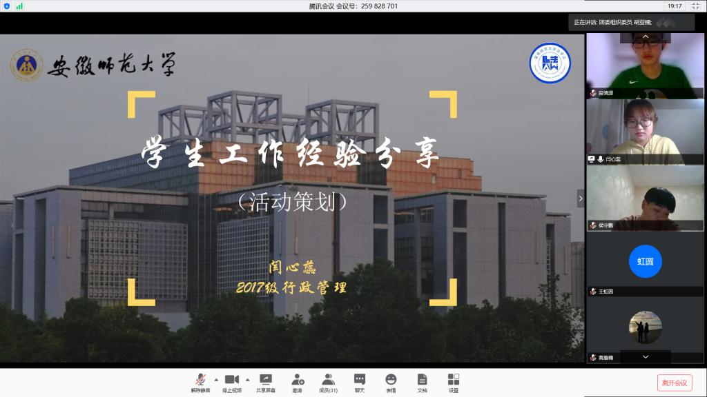 5月6日晚,英国上市公司365在腾讯会议平台举办了第七期“律政菁英”员工干部骨干培训班第五讲课程活动。此次课程由英国上市公司365第五届院员工会主席团成员张家志和第六届团委办公室主任闫心蕊主讲,院团委书记王虹圆出席,院团委组织委员胡亚楠主持,培训班全体成员参加。